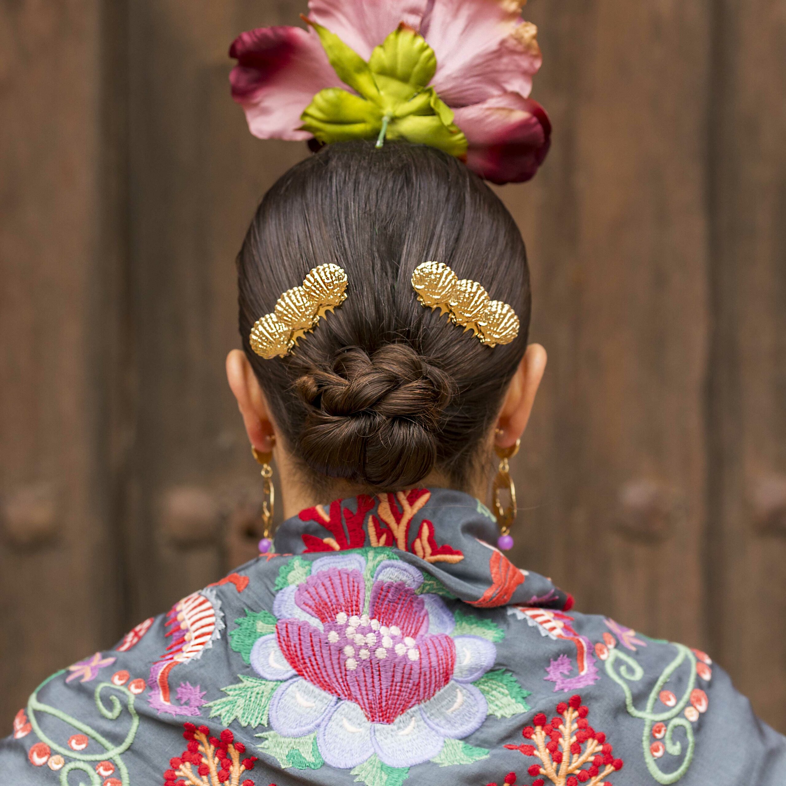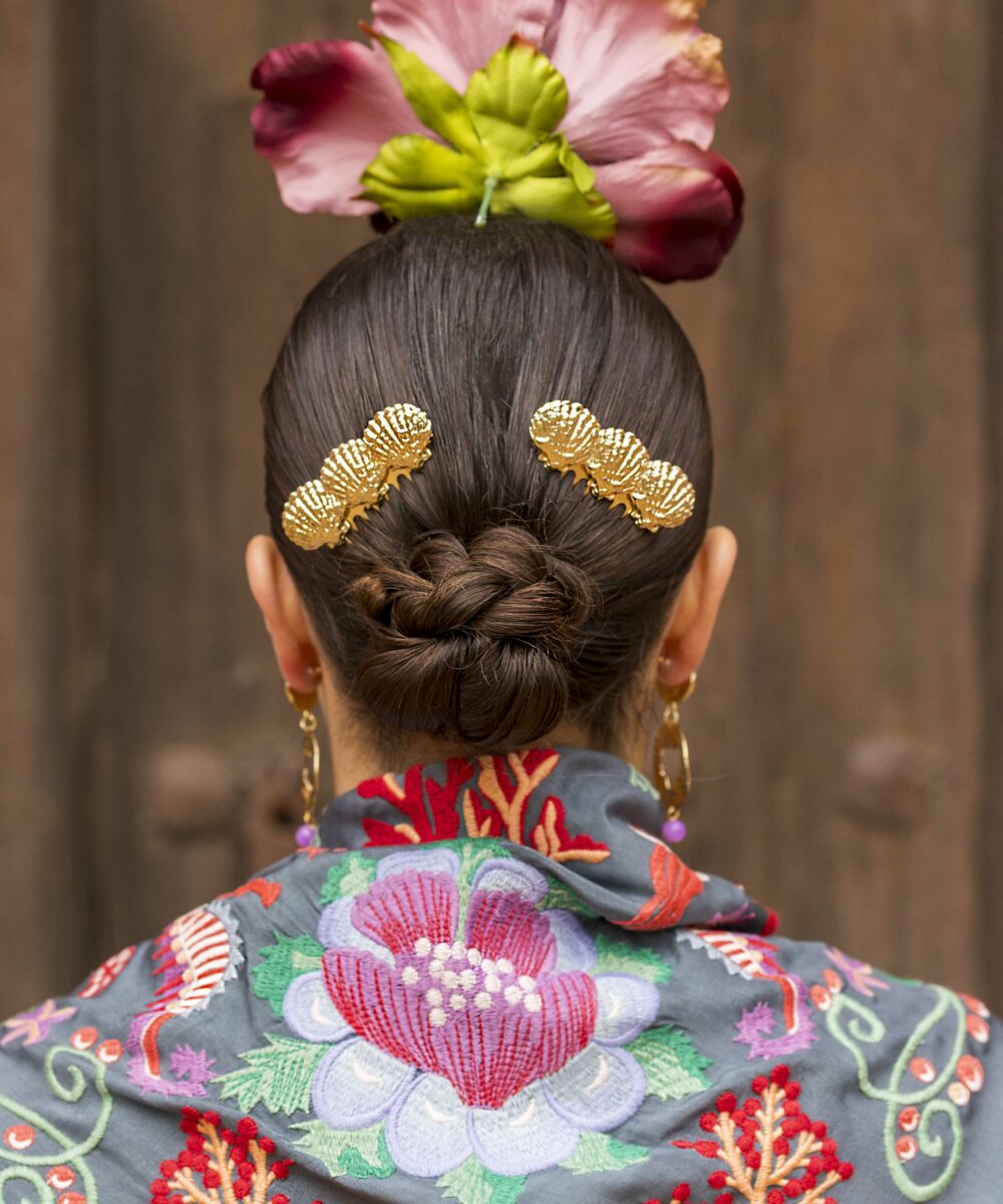 Además, explora nuestra colección de complementos, como pendientes y peinecillos, diseñados y fabricados por nuestra marca aquí en el taller. ¡Atrévete a lucir única y elegante en la próxima feria con el Mantoncillo Mar DW verde petróleo!