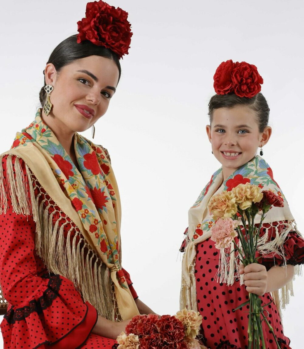 Además, si te encanta ir a conjunto con tu hija, este mantoncillo se puede comparar con el de mamá, creando un look flamenco coordinado y lleno de estilo. Su diseño incluye fleco de borlón corto, con un nudo sencillo, que está muy en tendencia este año en pasarelas como SIMOF y We Love Flamenco. Este tipo de fleco es elegante, moderno y le da un toque único al mantoncillo, haciendo que tu niña luzca espectacular.