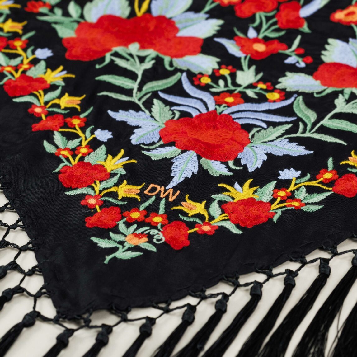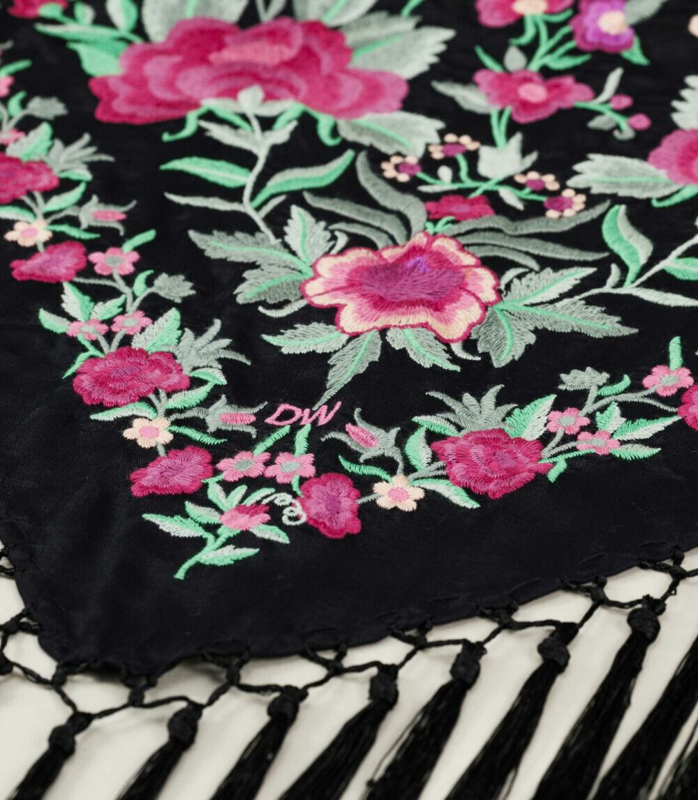 Los mantoncillos de la Darwin Collection son piezas artesanales confeccionadas con seda teñida a mano y flecado manual, utilizando hilo del mismo tono. Esta dedicación artesanal los convierte en piezas delicadas y únicas.