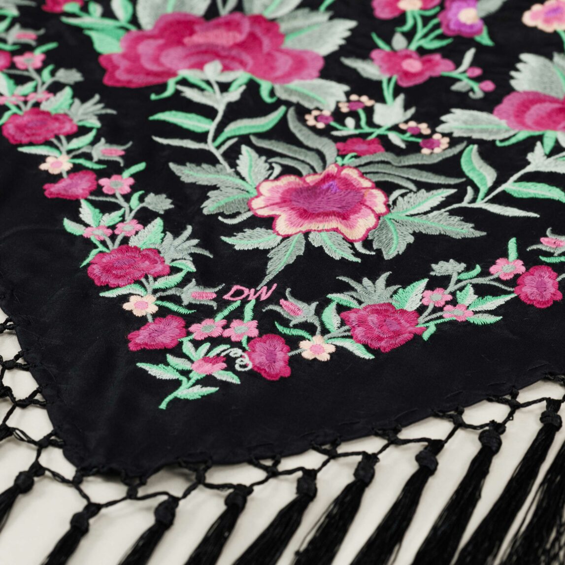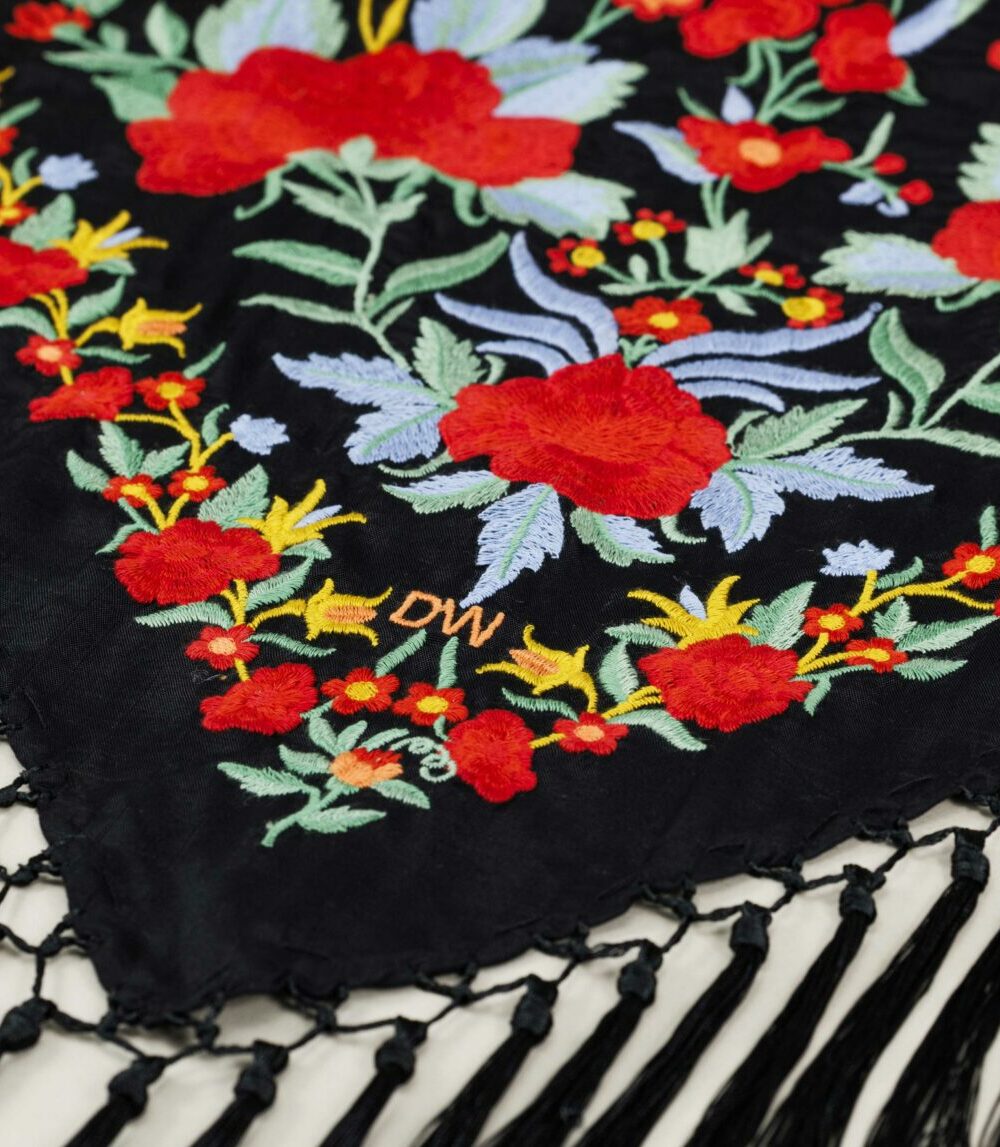 El flecado de nuestros mantones se realiza con gran destreza de forma artesanal. Además, este mantón de flamenca está bordado en varios colores, lo que le proporciona infinitas posibilidades de combinación.