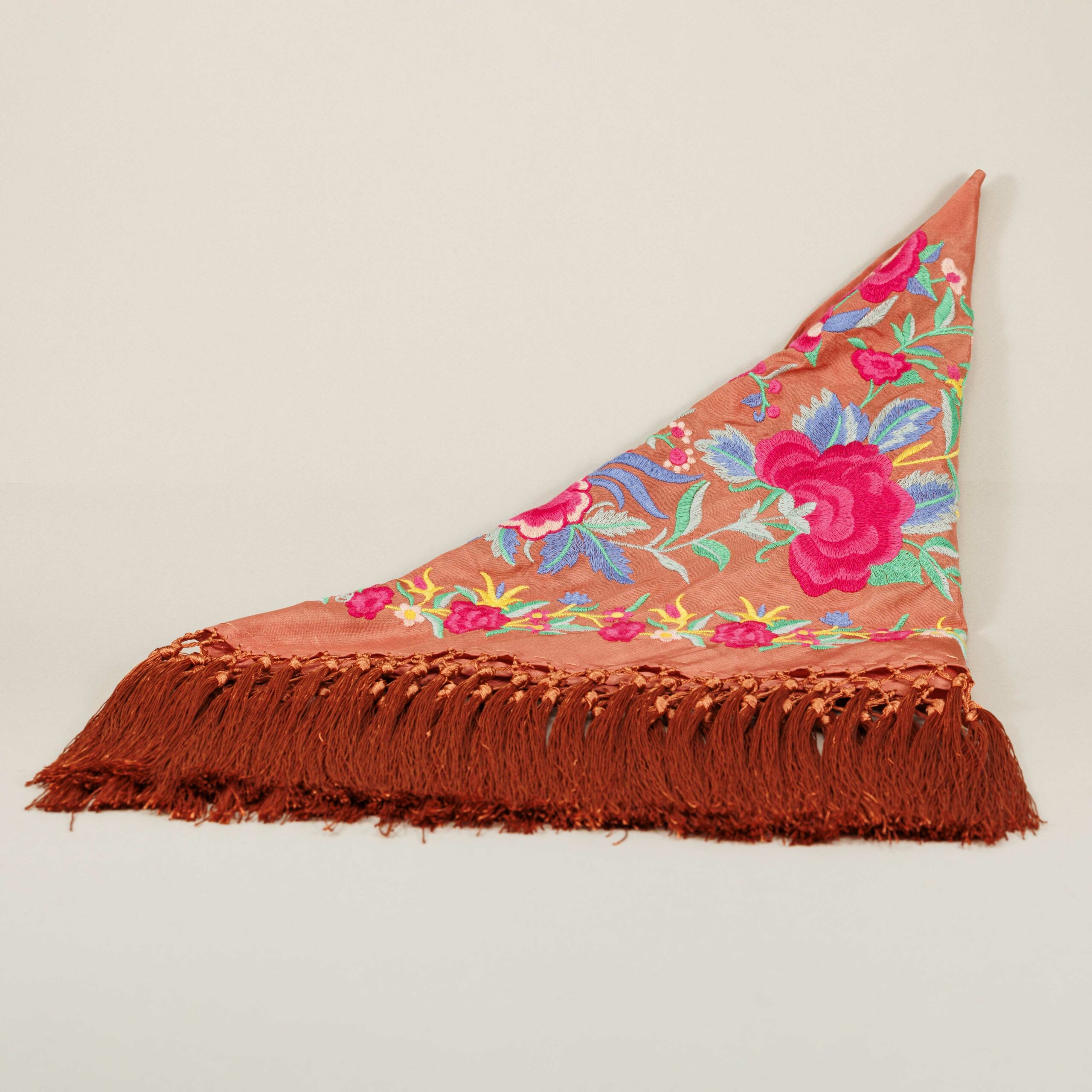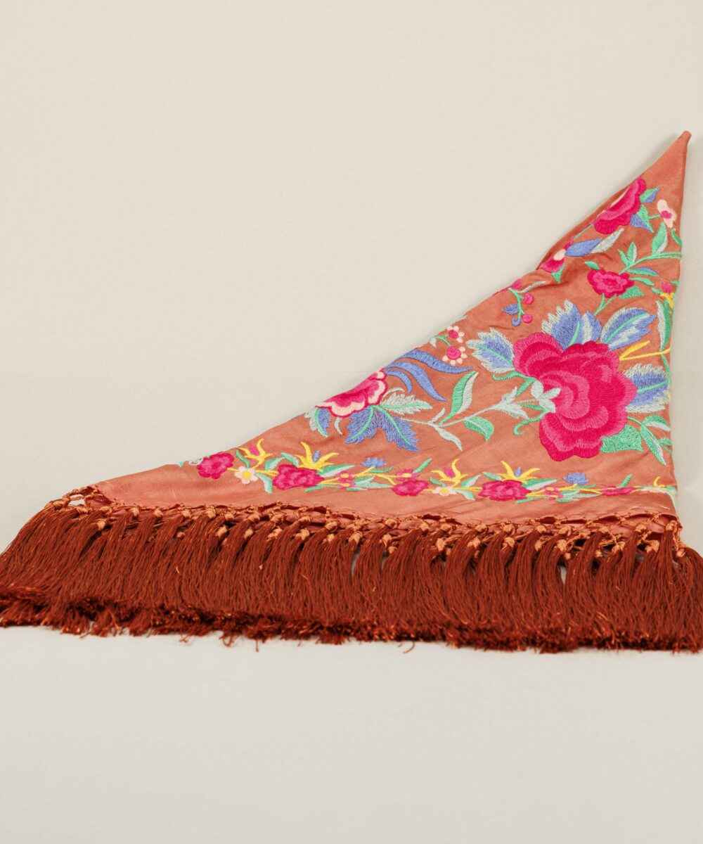 Los mantoncillos de la Darwin Collection son piezas artesanales confeccionadas con seda teñida a mano y flecado manual, utilizando hilo del mismo tono. Esta dedicación artesanal los convierte en piezas delicadas y únicas.