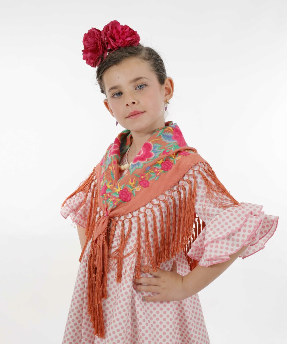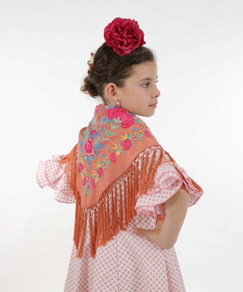 El Mantoncillo Niña Rosario Salmón mantiene el mismo diseño exclusivo y detallado que su versión para adultos, con bordados cuidadosamente realizados que aportan un aire tradicional y lleno de personalidad. Es el complemento ideal para hacer que tu hija se vea y se sienta única, destacando en cualquier evento.