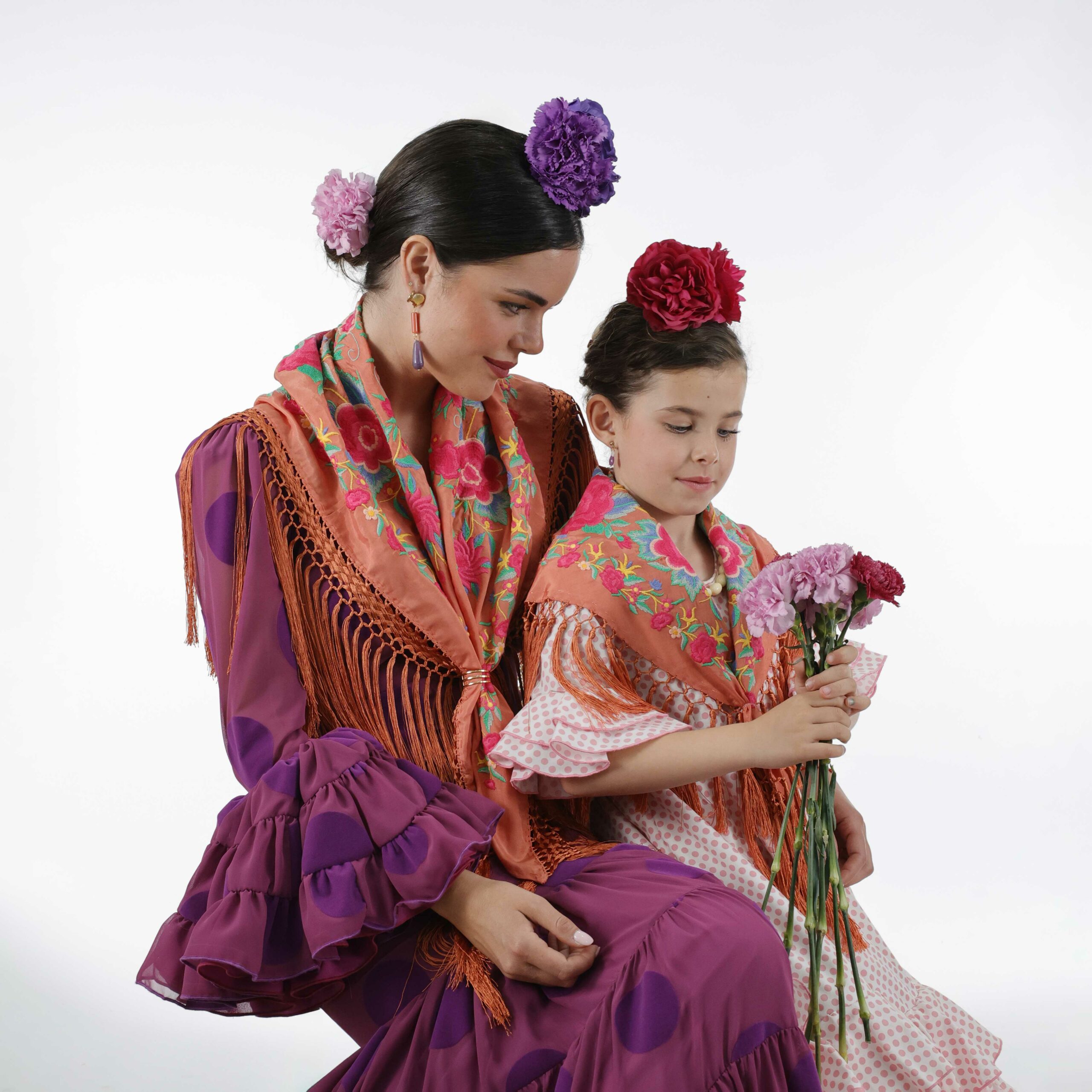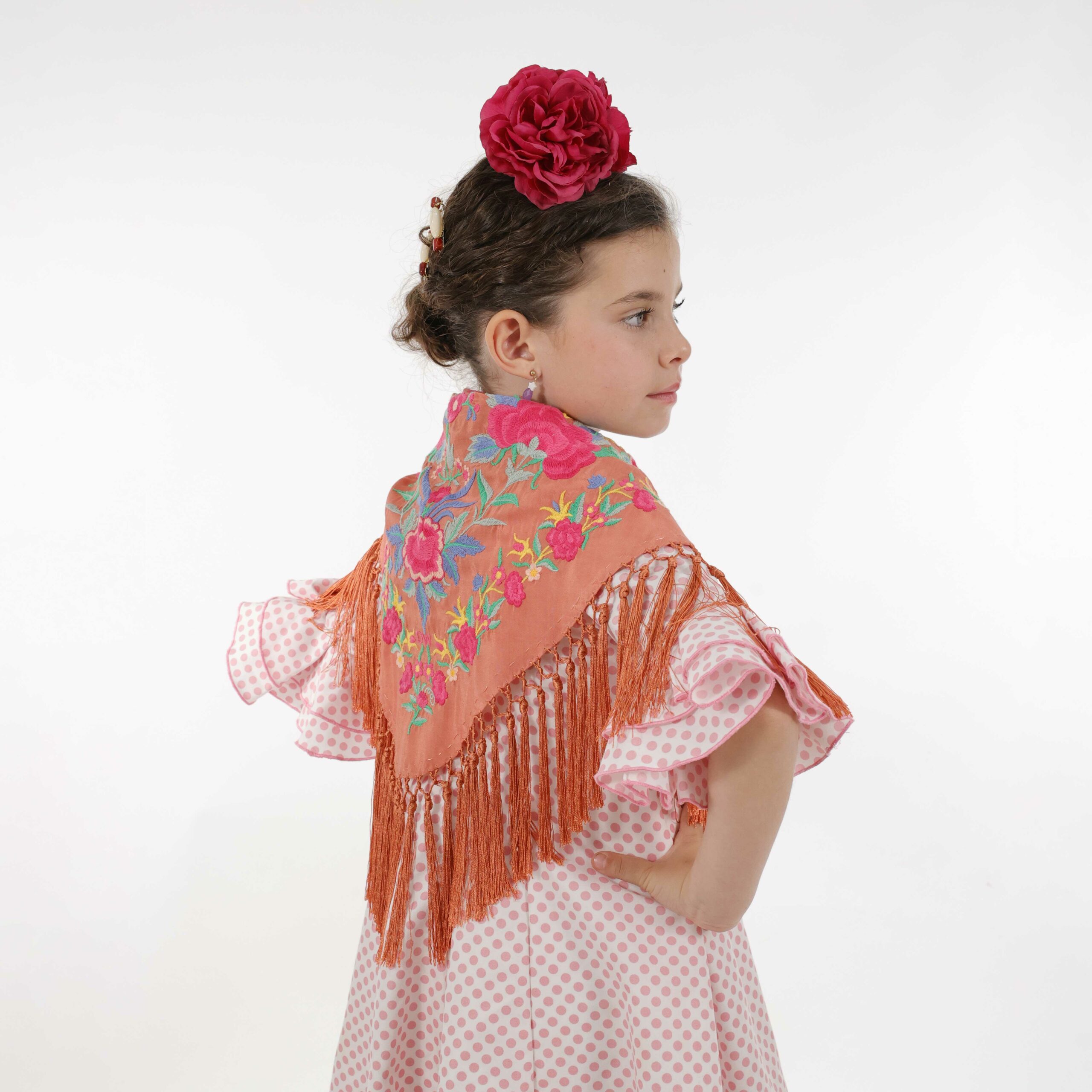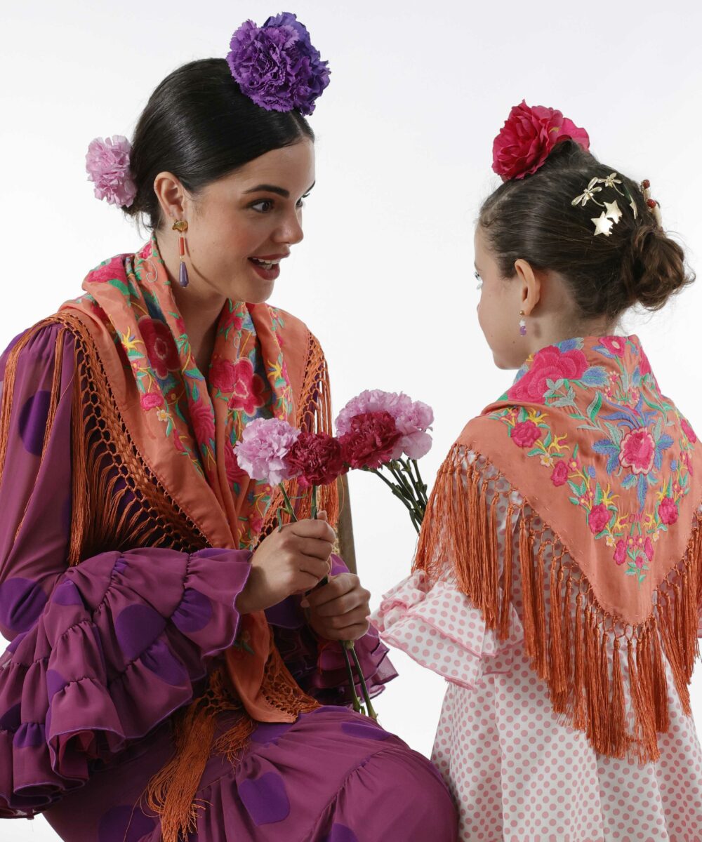 No olvides completar su look con nuestros pendientes y peinecillos, diseñados y fabricados en nuestro taller. ¡Luce única y deslumbra en la Feria con el Mantoncillo Niña Rosario Salmón!