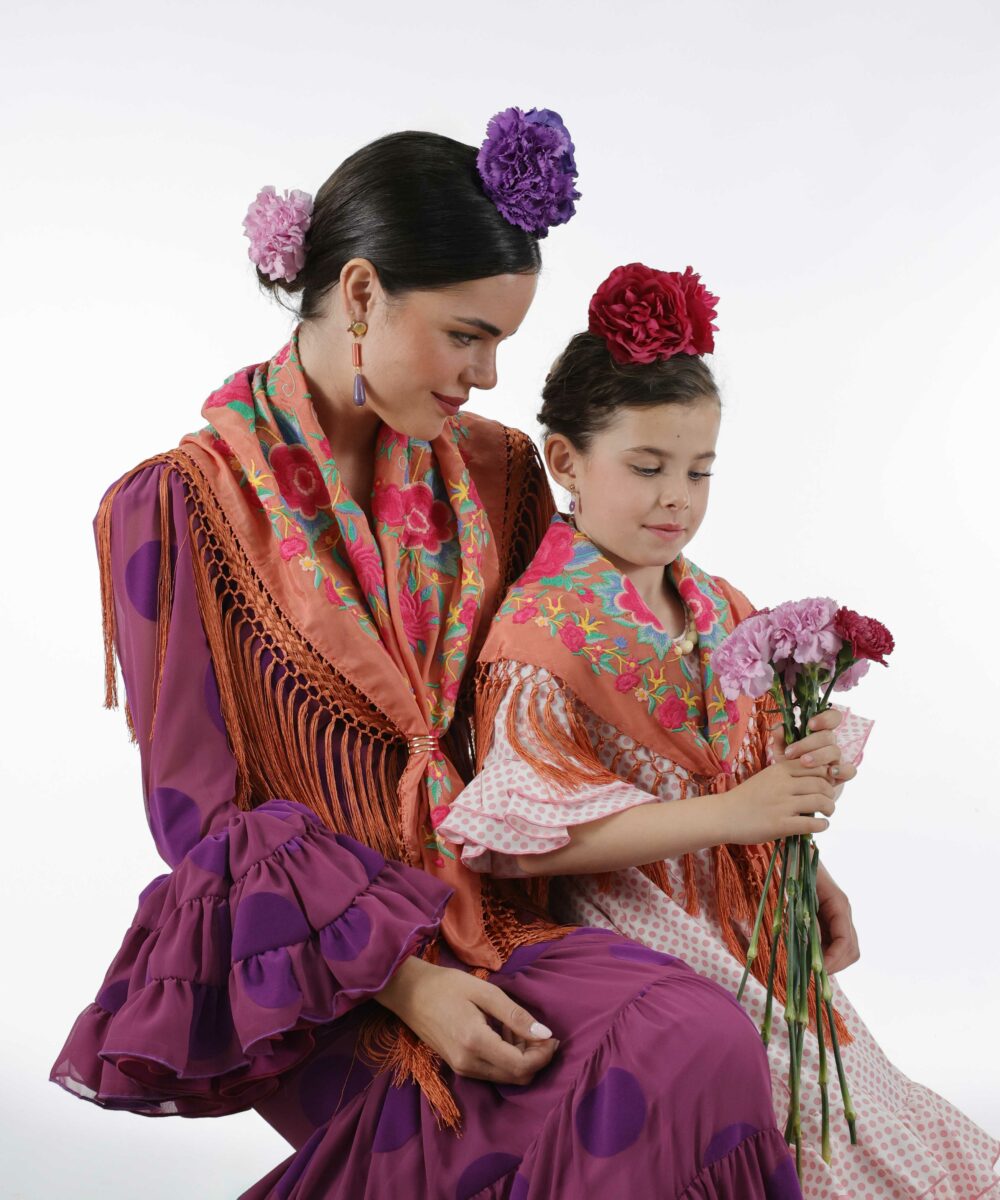 Además, si te encanta ir a conjunto con tu hija, este mantoncillo se puede comparar con el de mamá, creando un look flamenco coordinado y lleno de estilo. Su diseño incluye fleco de borlón corto, con un nudo sencillo, que está muy en tendencia este año en pasarelas como SIMOF y We Love Flamenco. Este tipo de fleco es elegante, moderno y le da un toque único al mantoncillo, haciendo que tu niña luzca espectacular.