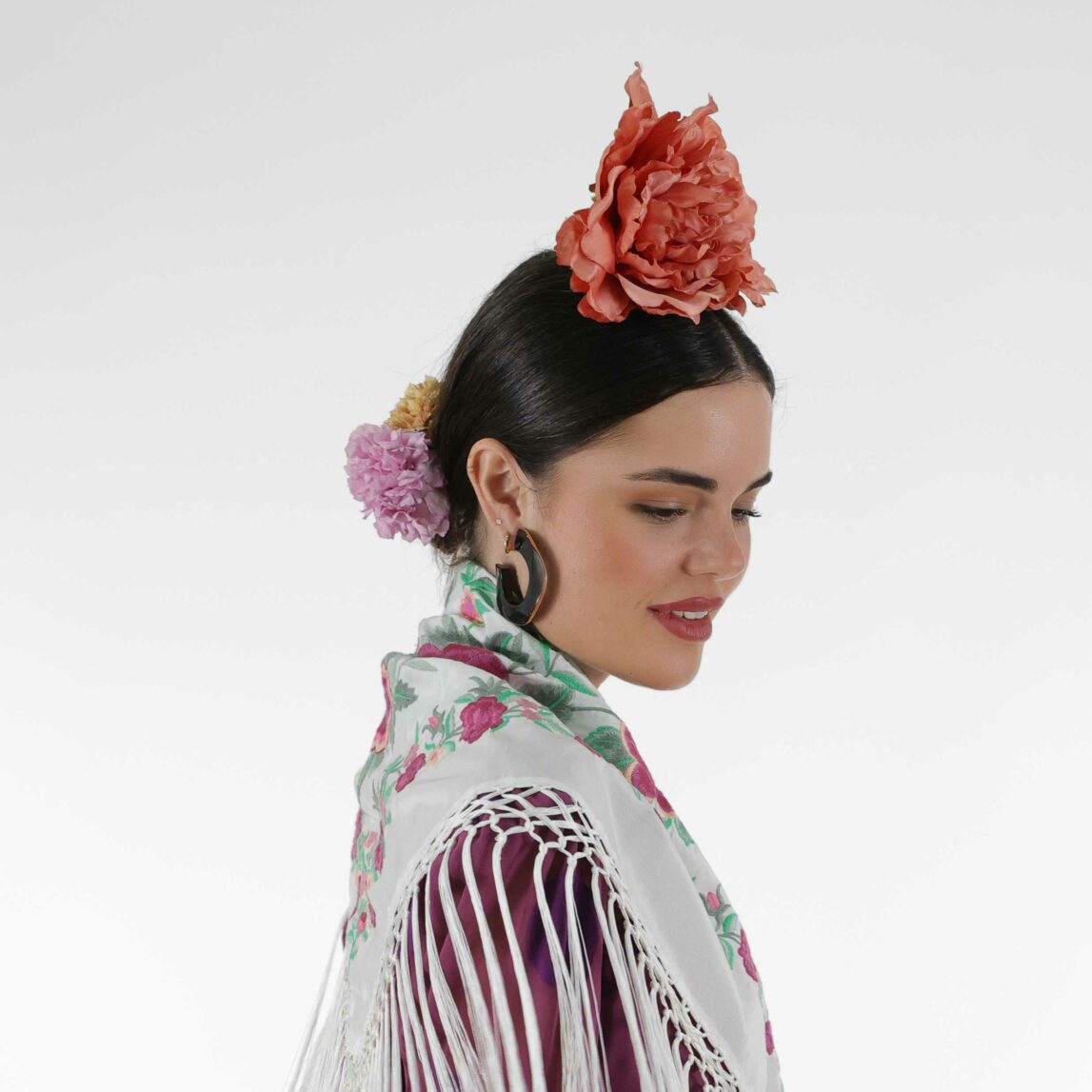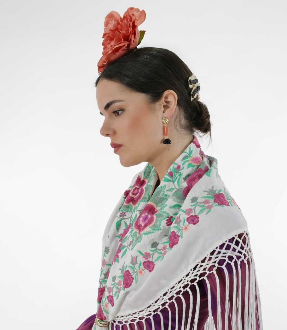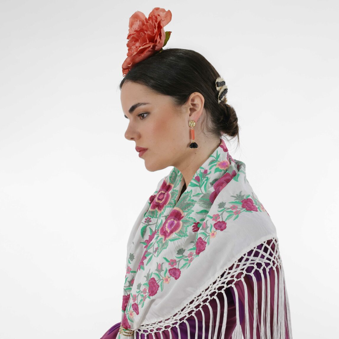 1.- Con el Mantoncillo Rosario DW blanco bordado buganvilla, lleva los Pendientes aro Alice y la Flor Flamenca Peonía Blossom