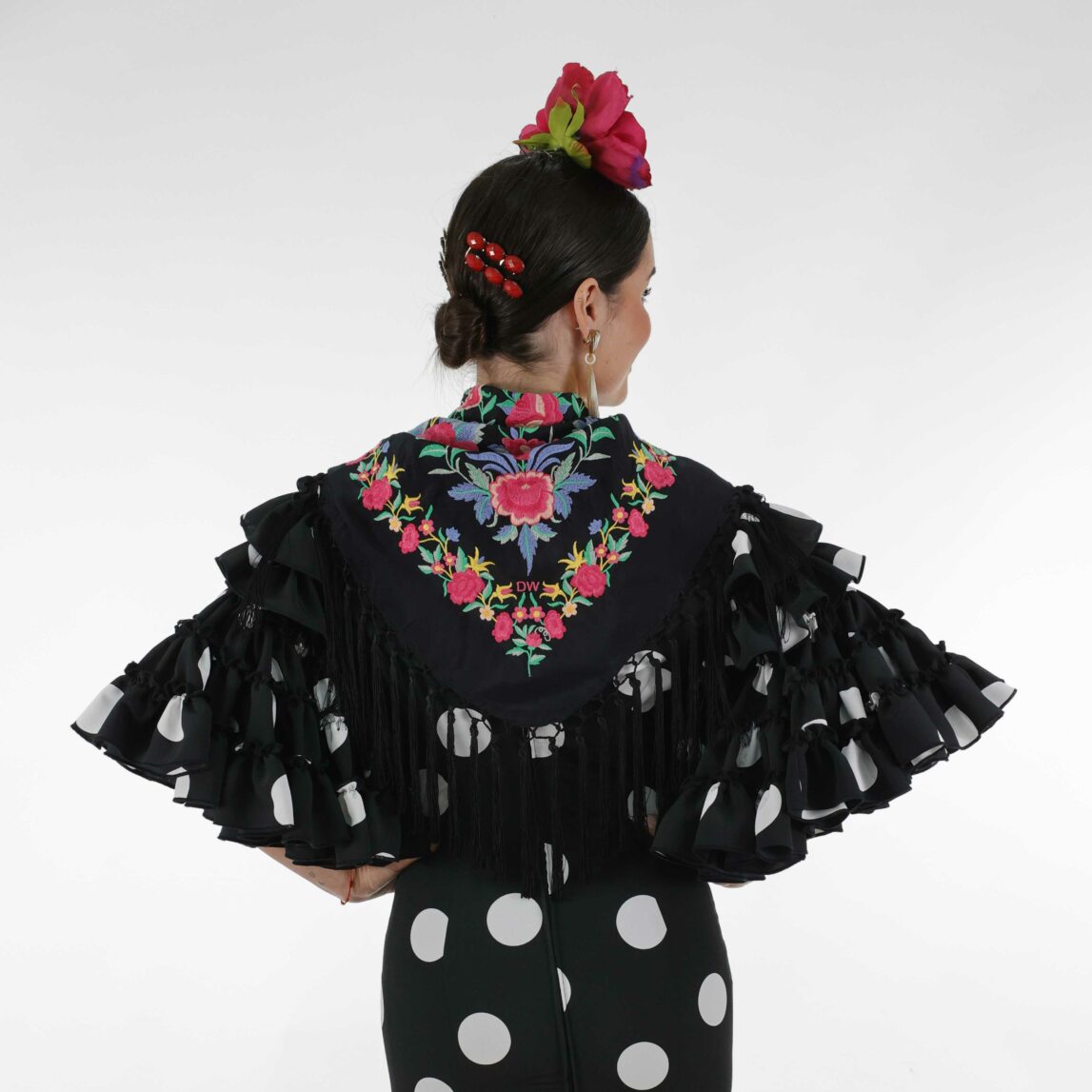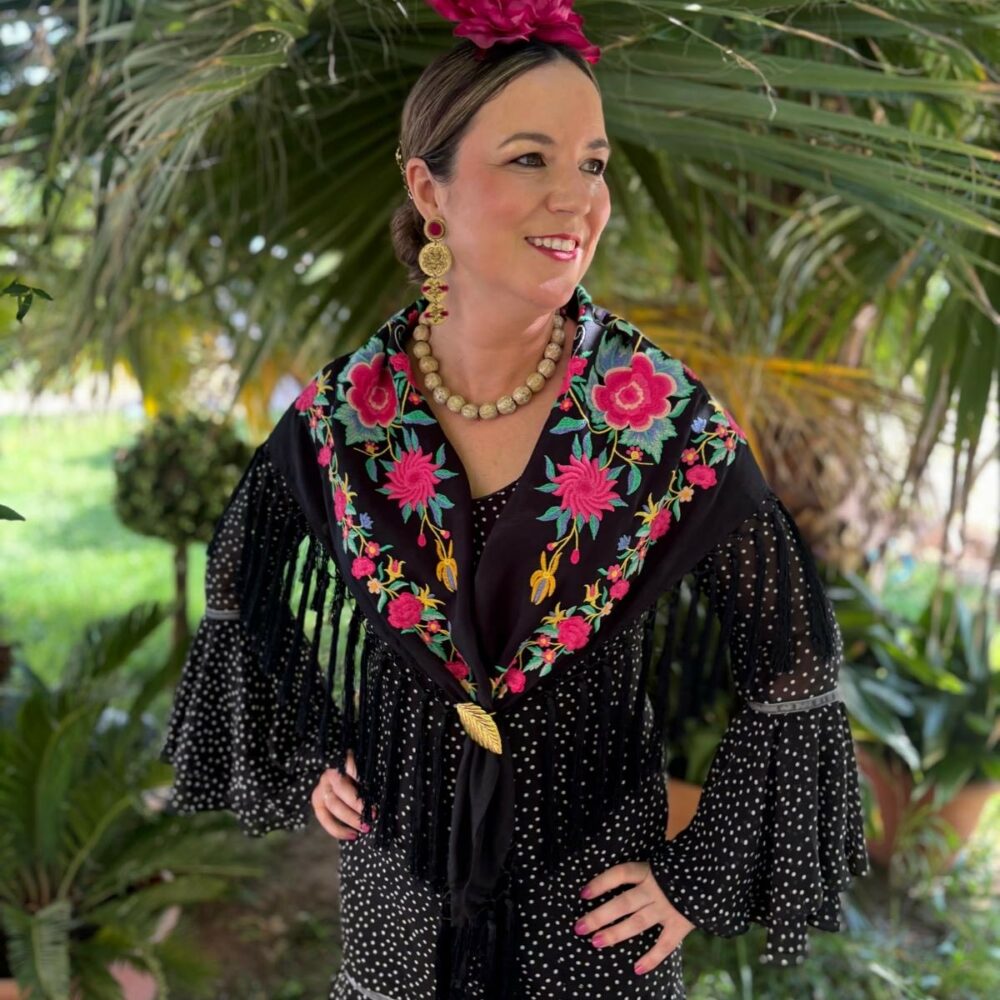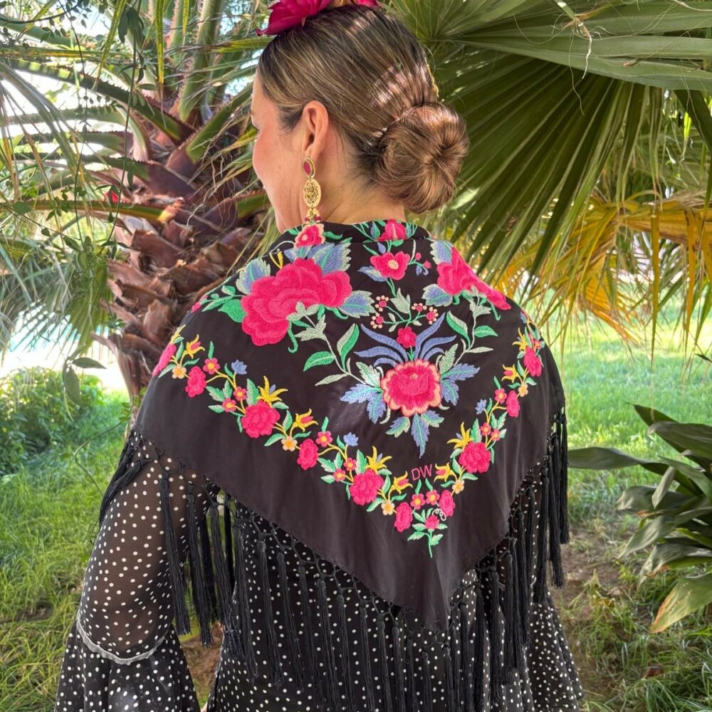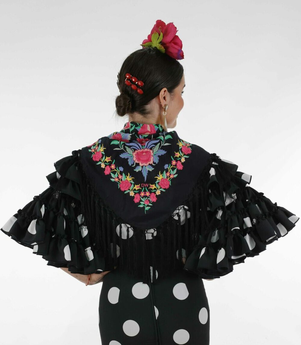 Si buscas un mantón con personalidad, diseño exclusivo y tradición, el Mantoncillo Rosario  DW negro es para ti. Forma parte de nuestra Colección de Feria 2025 y está disponible en unidades limitadas, lo que lo convierte en una auténtica joya.