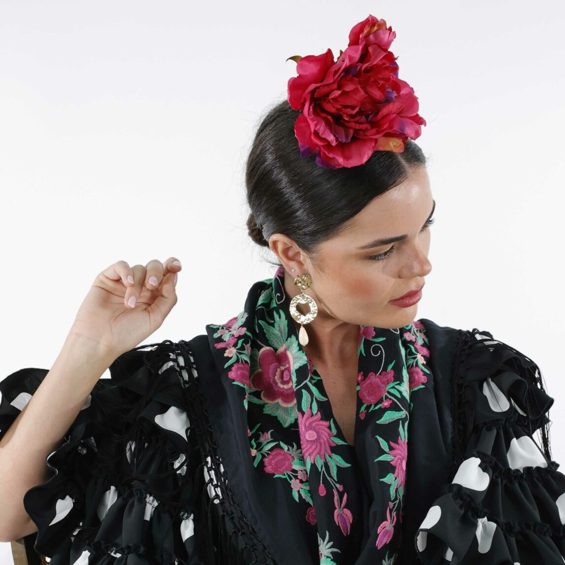 No olvides completar tu look con nuestros pendientes y peinecillos, diseñados y fabricados en nuestro taller. ¡Luce única y deslumbra en la Feria con el Mantoncillo Rosario DW!