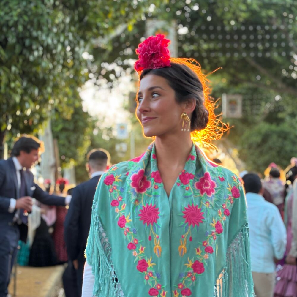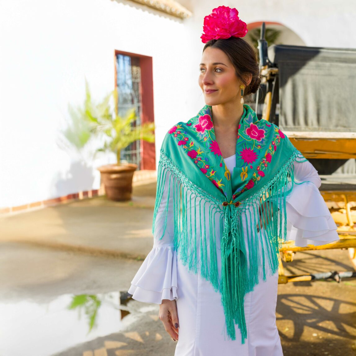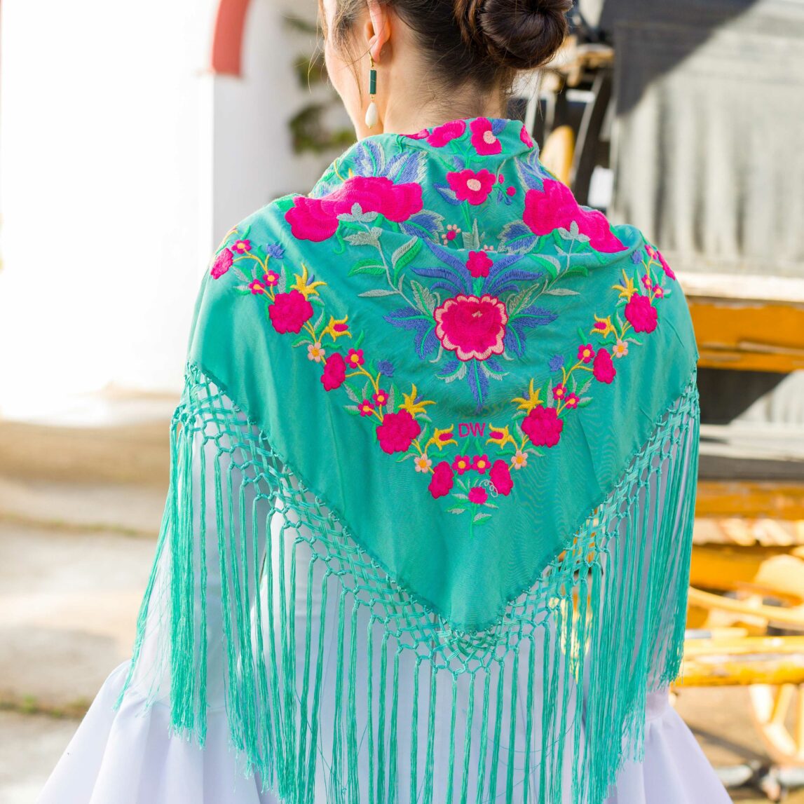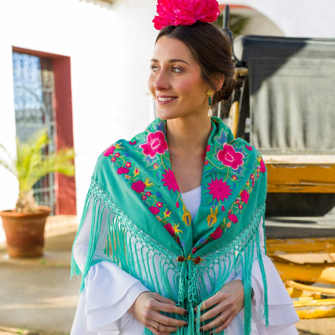 Si buscas un mantón con personalidad, diseño exclusivo y tradición, el Mantoncillo Rosario  DW verde agua es para ti. Forma parte de nuestra Colección de Feria 2025 y está disponible en unidades limitadas, lo que lo convierte en una auténtica joya.