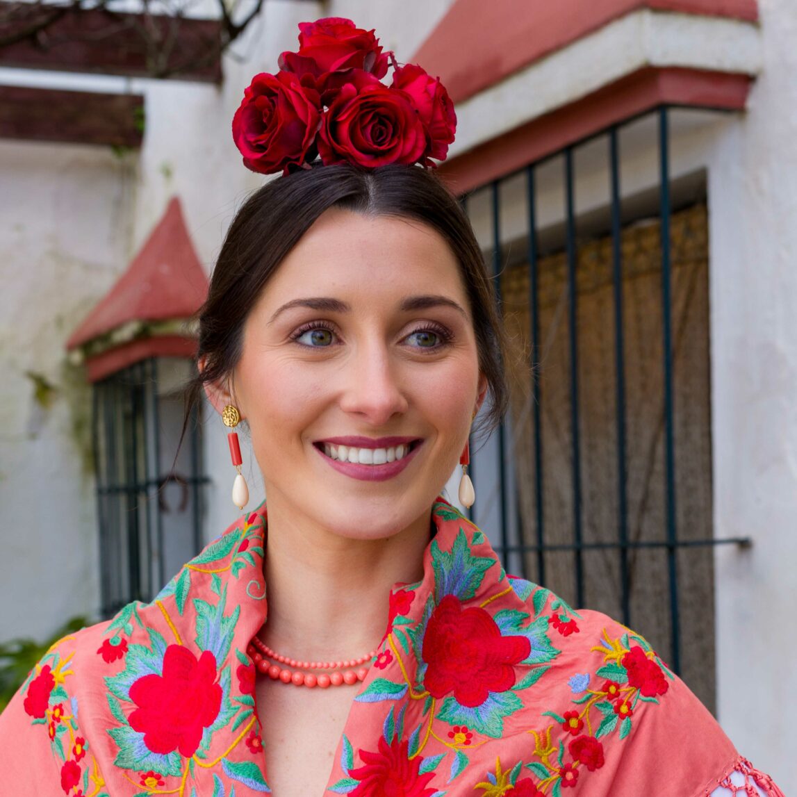 2.- Con el Mantoncillo Rosario DW fresa bordado en rojo, lleva el Ramillete flamenca rosas rojas ,los Pendientes flamenca Dolores   y dos collares finitos en color salmón del Collar Carmela.