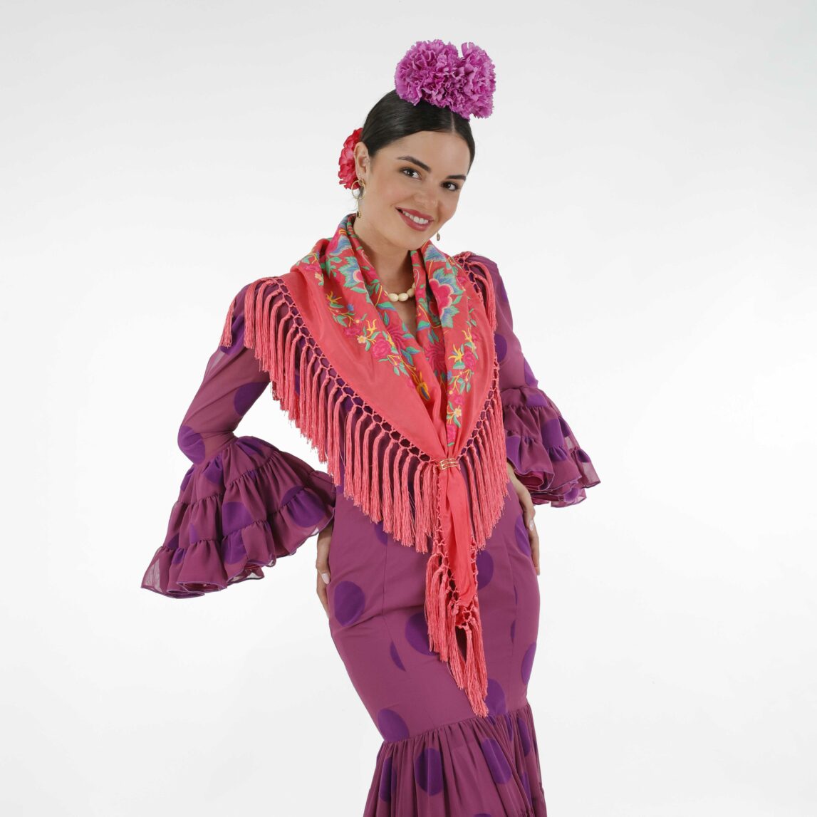 1.- Con el Mantoncillo Rosario DW fresa bordado en fucsia, lleva el Ramillete Claveles Lavanda y los Pendientes invitada Carmina.