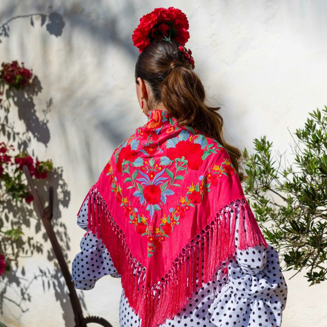 Este mantón nació de un boceto a mano alzada, que luego digitalizamos y perfeccionamos, eligiendo cuidadosamente los colores para el bordado y la seda teñida a mano. Su diseño es todo un homenaje a la Feria de Abril: dos grandes claveles en el centro, acompañados de una rosa grande y rodeado por una cenefa de flores que realza cada detalle del bordado.