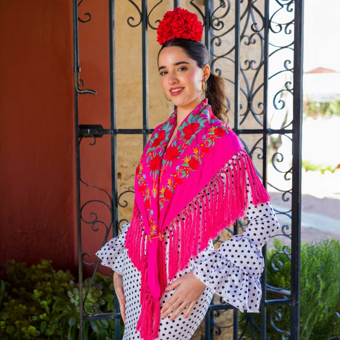 Si buscas un mantón con personalidad, diseño exclusivo y tradición, el Mantoncillo Rosario  DW fucsia es para ti. Forma parte de nuestra Colección de Feria 2025 y está disponible en unidades limitadas, lo que lo convierte en una auténtica joya.