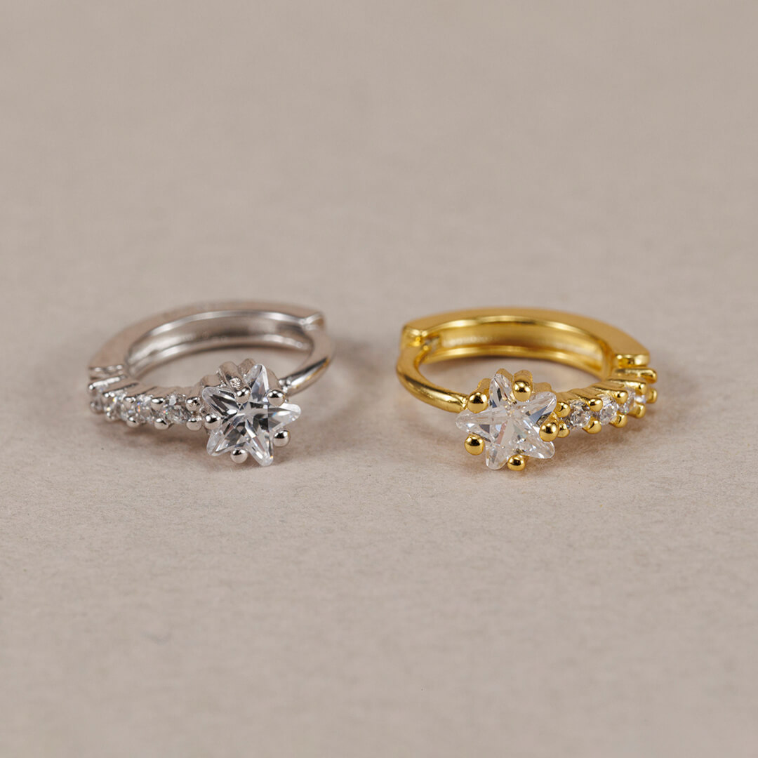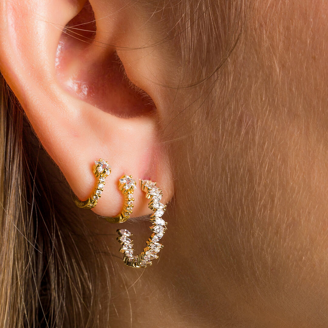 El mini arito Jess es de plata esterlina 925 bañada en oro, con circonitas blancas a lo largo de todo el pendiente. Este mini arito Jess tiene un detalle muy especial que lo hace diferente: tiene una circonita  algo más grande en la parte central superior, con forma de una pequeña estrella de cinco puntas. Al ser blancas las circonitas, es un arito que puede combinarse muy fácilmente con el resto de mini pendientes Darwin.