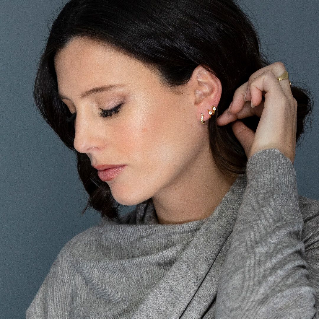 Puedes llevarlo solo para un look sencillo y elegante o combinarlo con otros mini pendientes y aros dorados para crear una composición única. Queda perfecto con jeans y camiseta, o con un vestido más formal —tú decides el estilo.