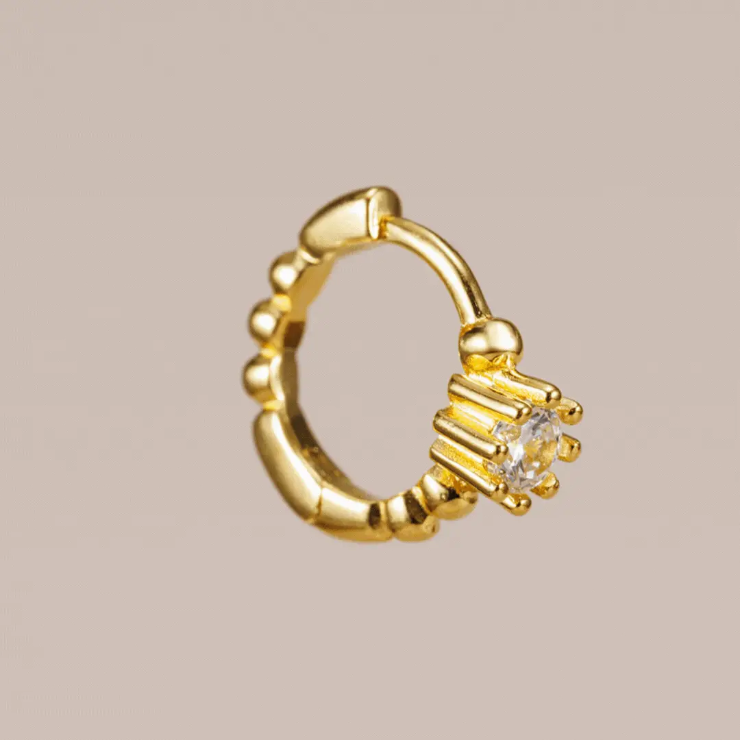 Un aro sencillo, con cómodo cierre de clic, y que lleva un detalle labrado en forma de bolitas con una circonita, blanca o negra, en la parte delantera.