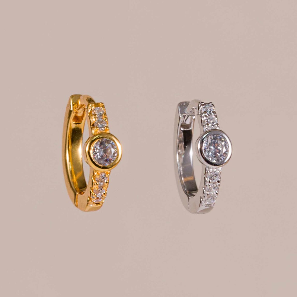 El Mini Aro Camila presenta una línea de circonitas engarzadas que capturan la luz de manera delicada. En su mitad, una circonita encastrada en un círculo con bordes redondos agrega un toque de encanto adicional. Esta joya es la definición de elegancia simple que nunca pasa de moda.