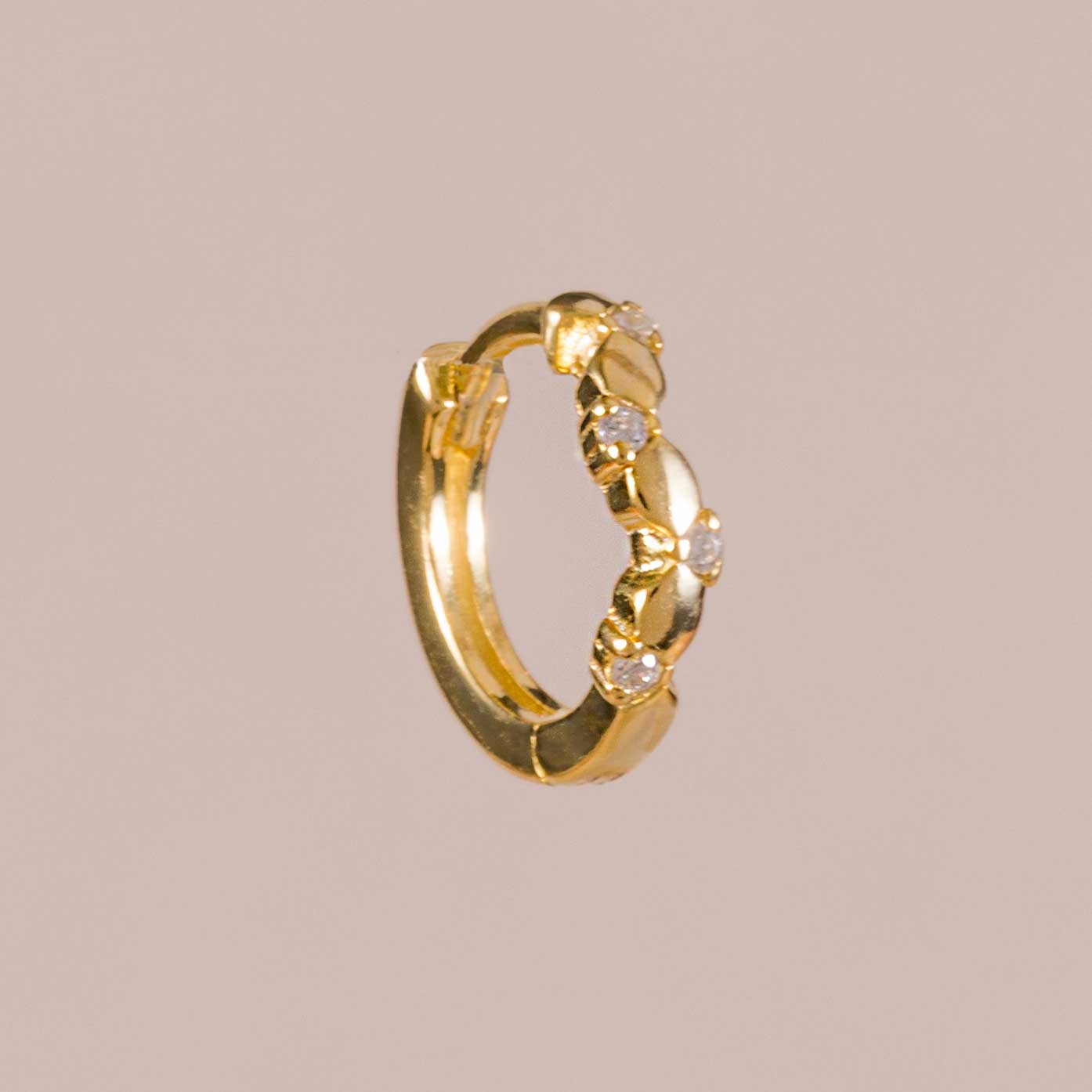 Con un diseño de líneas sencillas que nunca pasa de moda, este mini aro presenta en su parte delantera cuatro circonitas engarzadas, creando un efecto deslumbrante que captura la luz de manera delicada.