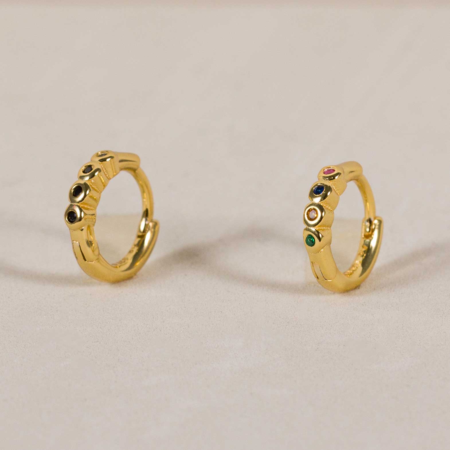 El Mini Aro Inés está fabricado en plata de ley 925 con un baño de oro de 18 quilates. Nuestro Aro Inés tiene un cierre de presión. Lo tenemos disponible en dos modelos ; uno con circonitas de colores y  otro con circonitas negras.