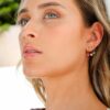 En la foto puedes ver cómo nuestra modelo lleva en la misma oreja los tres pendientes, cada uno de un color. Nos parece una idea muy cool. De primer pendiente lleva uno de color fresa, y como segundo y tercero, los mismos pero en otros colores. También puedes optar por llevar de primeros pendientes los Pendientes aro Estrella, y a modo de piercing, los Mini aro Kitty.