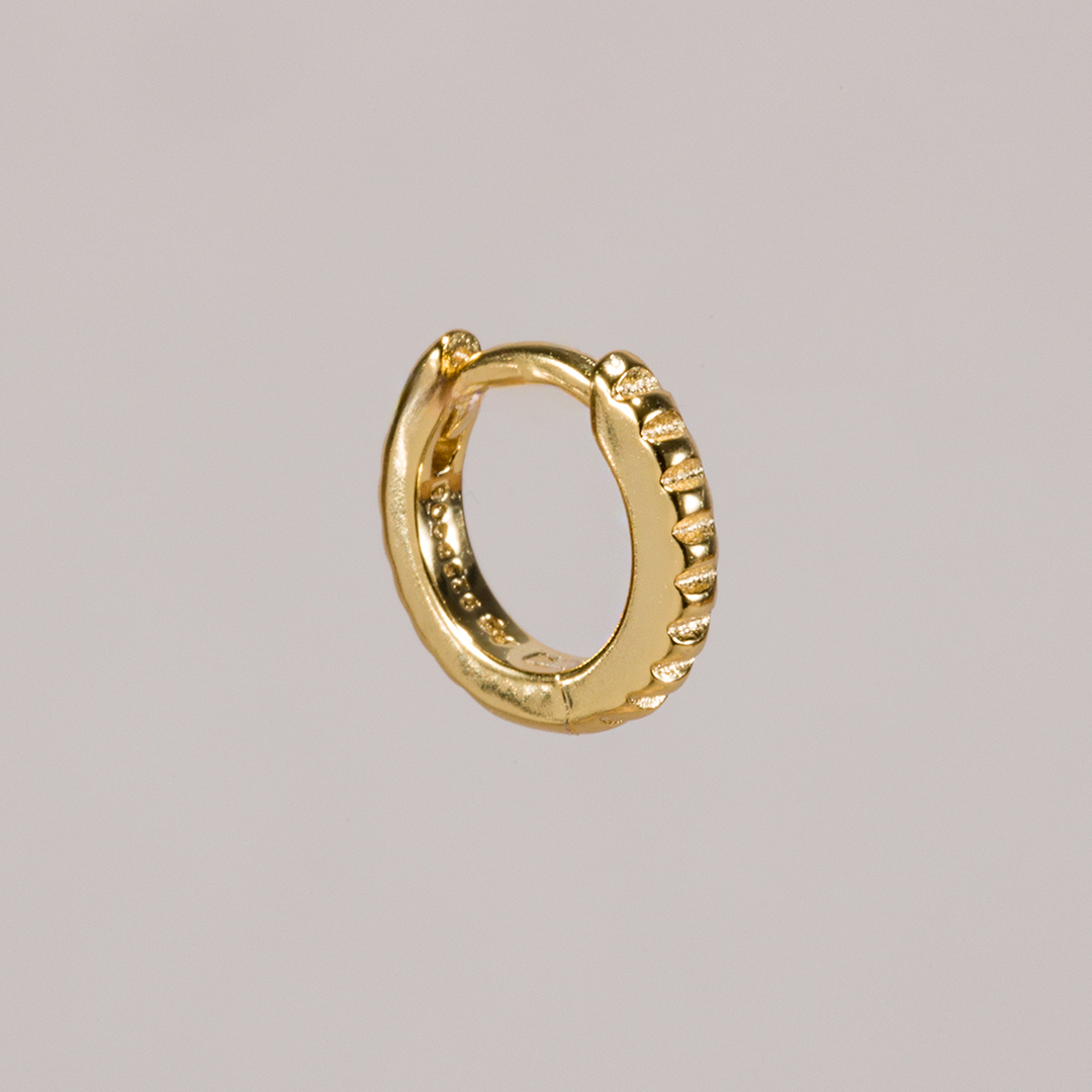 Fabricado en plata de ley 925 y cuidadosamente bañado en oro de 18 quilates, este mini aro ofrece durabilidad, brillo y resistencia al desgaste diario, garantizando que mantenga su estilo y elegancia por mucho tiempo. Su diseño con rayas sutiles aporta un toque moderno y original, perfecto para quienes buscan destacar con detalles discretos pero llenos de personalidad.