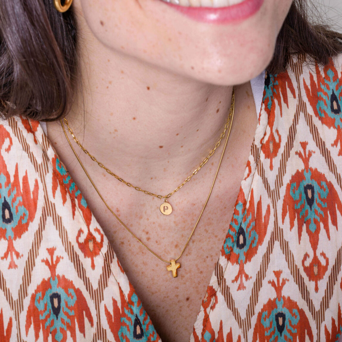 Cada chapa incluye un asa dorada de seguridad que puede abrirse con alicate para cambiarla de cadena sin riesgo de pérdida. Las cadenas con iniciales siguen siendo una tendencia atemporal.