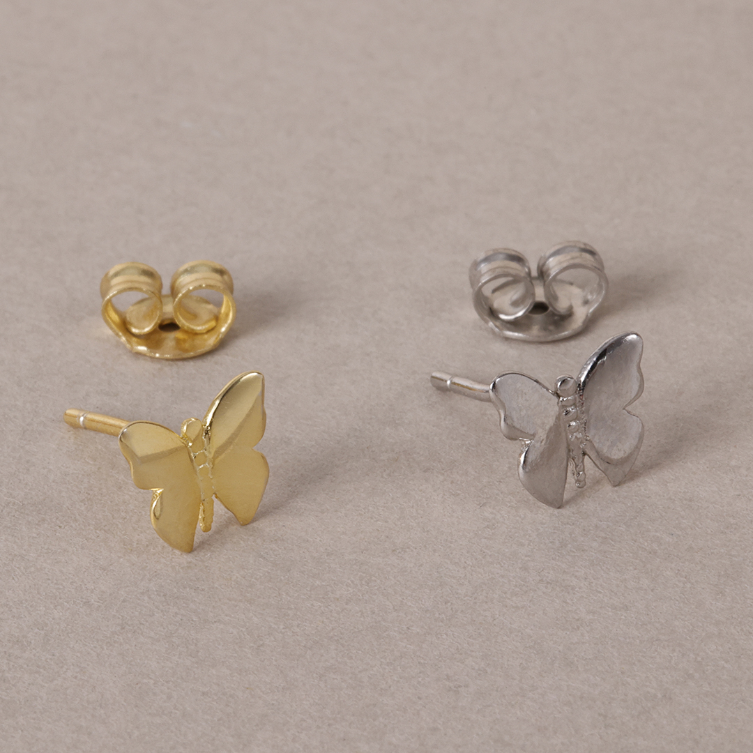 El Mini Pendiente Mariposa es de plata 925 con baño flash en oro de 18 quilates. Tiene un cómodo cierre de tornillo a presión tradicional.
