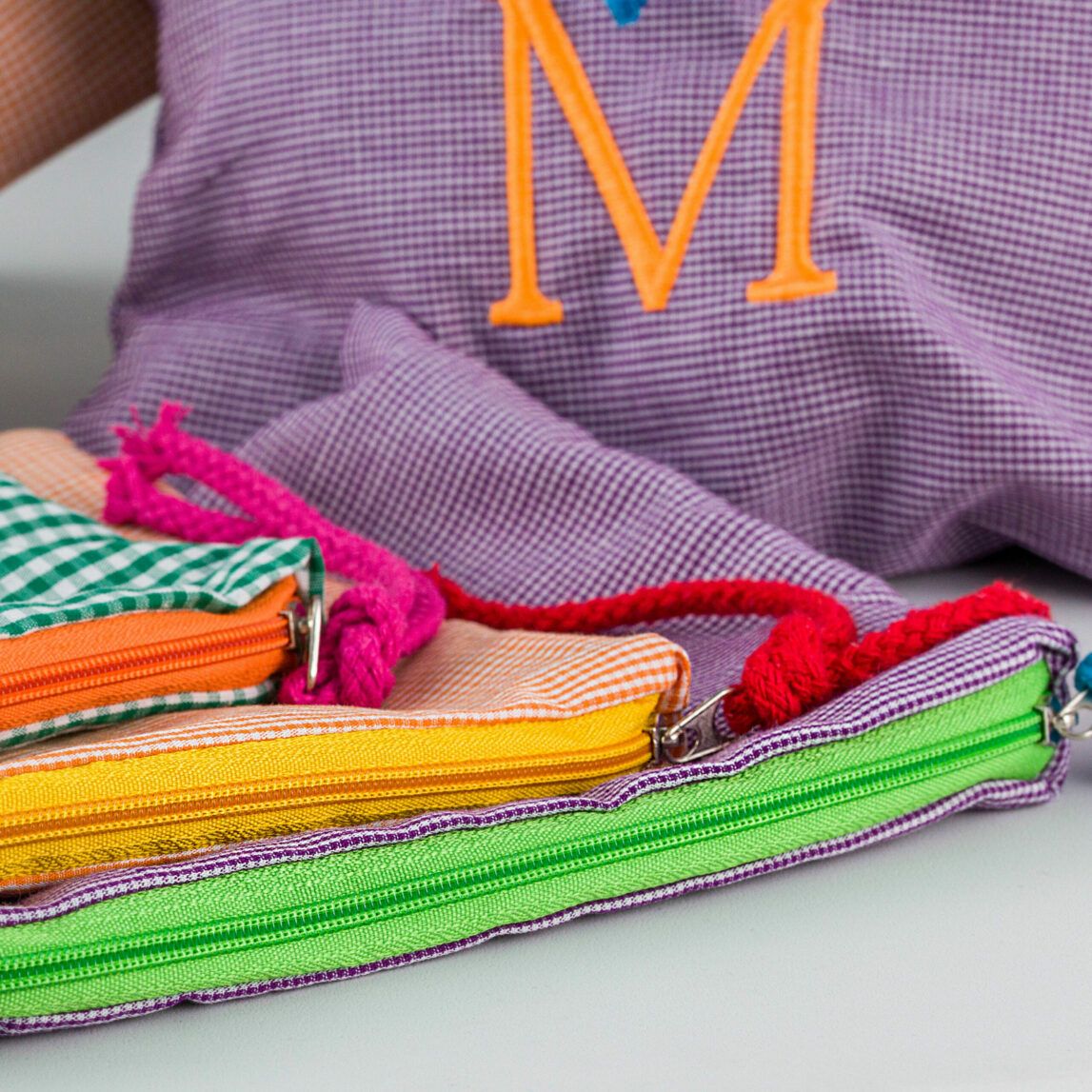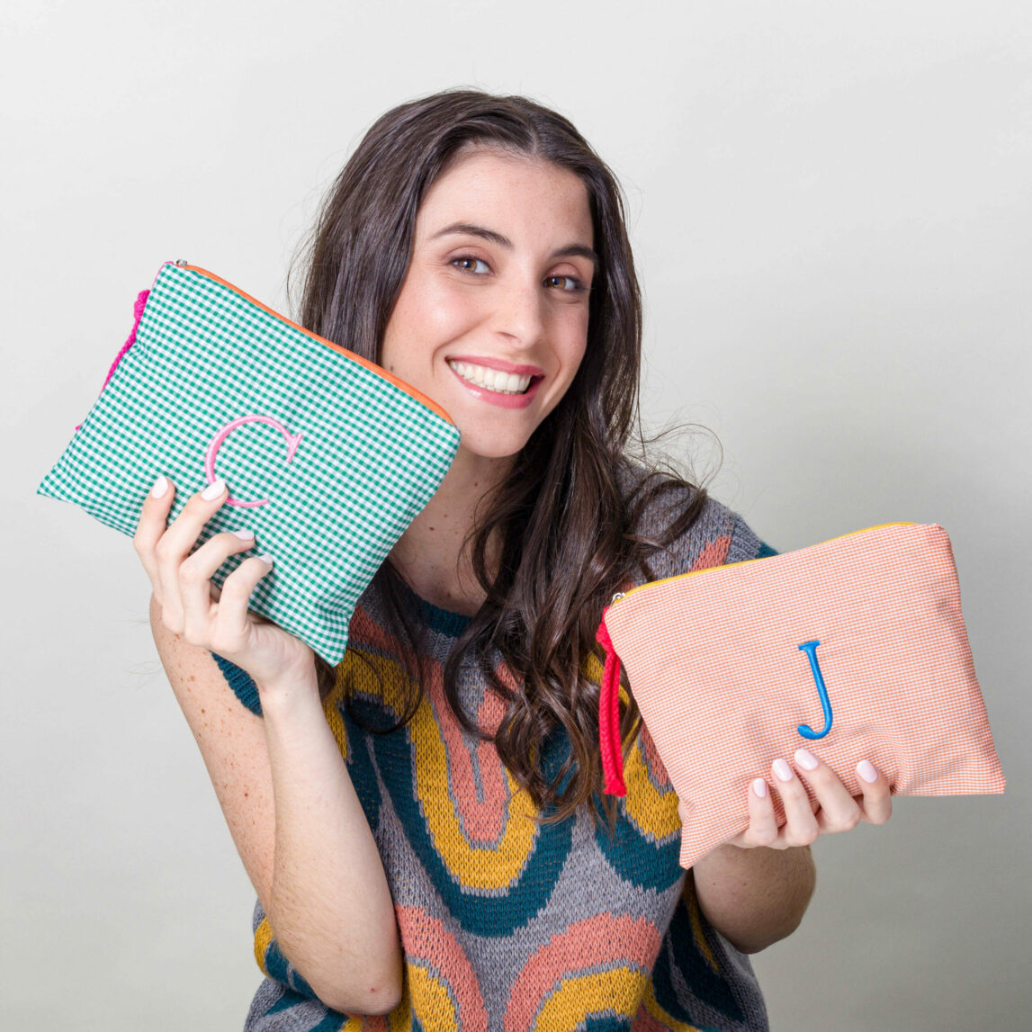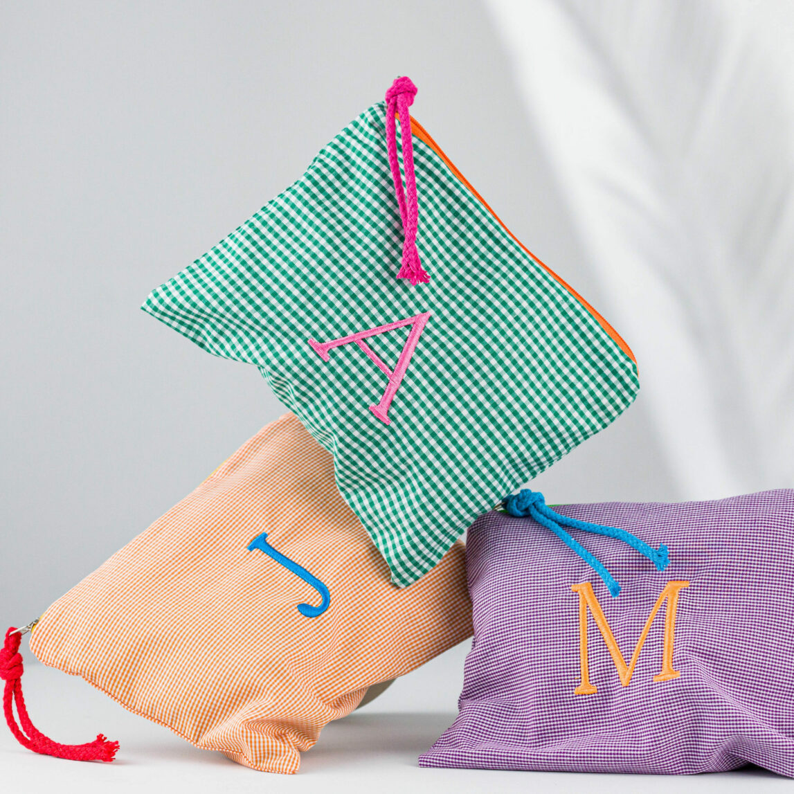 Neceser de tela estampada en cuadros Vichy, en diferentes colores: naranja y blanco, verde y blanco, y morado y blanco. Todos llevan forro interior verde oscuro y cremallera rematada a juego en color flúor. El neceser verde lleva la inicial bordada en color rosa fucsia, el neceser morado lleva el bordado en naranja flúor, y el neceser naranja lleva el bordado en azul azafata. Todos llevan una cinta a juego para tirar de la cremallera y se han hecho artesanalmente en un taller de Sevilla.