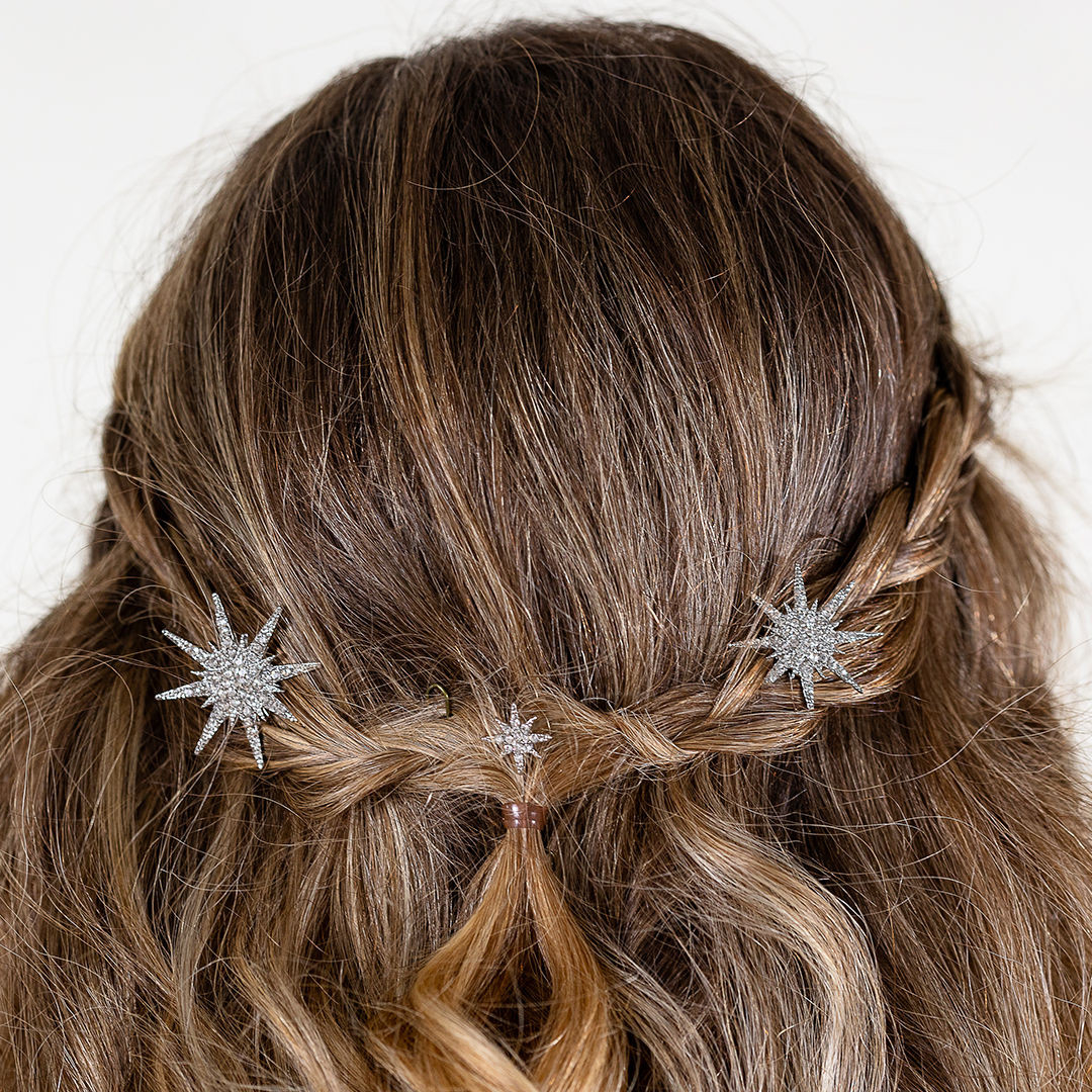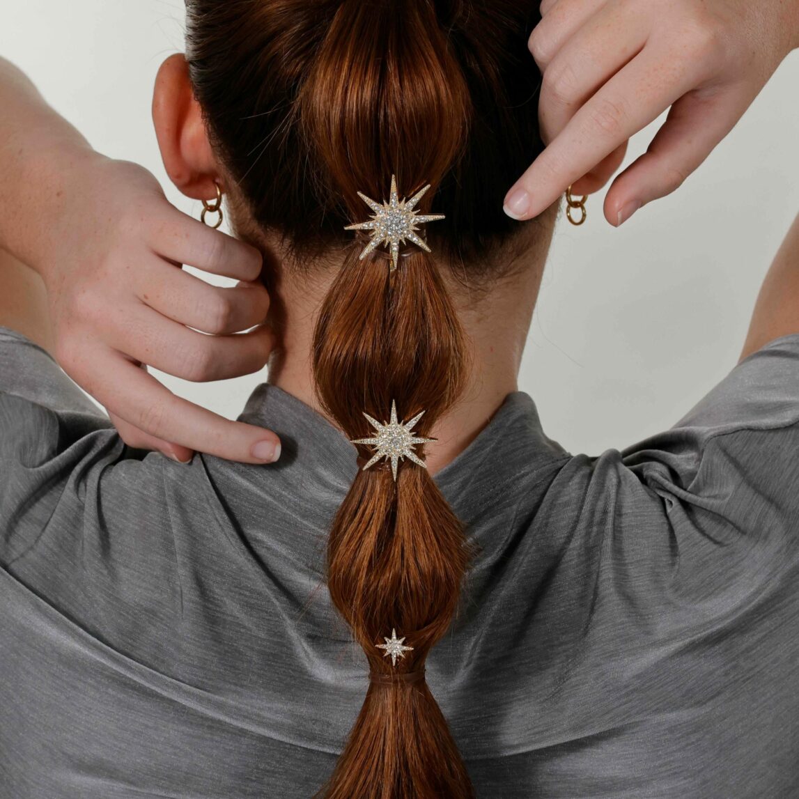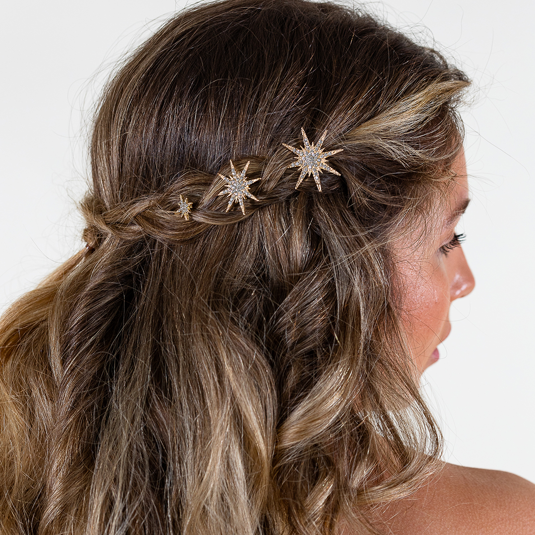 El diseño de nuestro Pack de Horquillas es precioso, es una pieza de acero en forma de estrella con circonita engarzada que da luz y brillo al pelo. Las horquillas vienen en tres tamaños para crear efecto de profundidad.