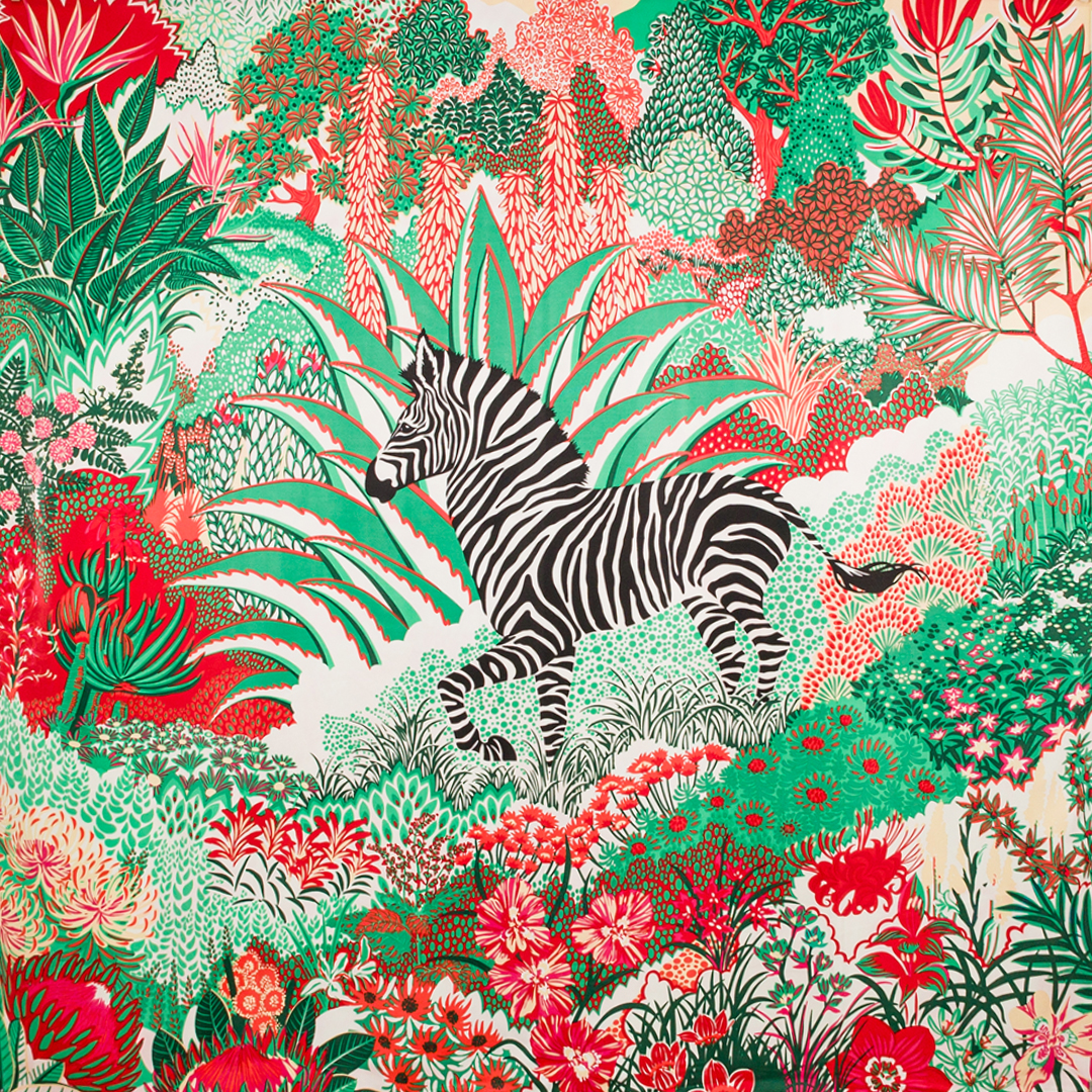 El Pañuelo Cebra con un estampado de cebra en la selva en tonos rojos y  verdes sobre fondo marfil, este pañuelo es una verdadera joya para cualquier amante de la moda.