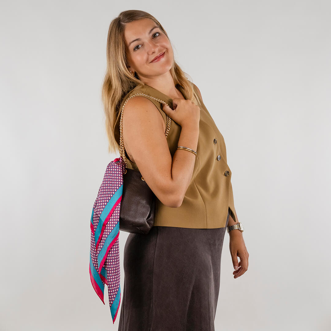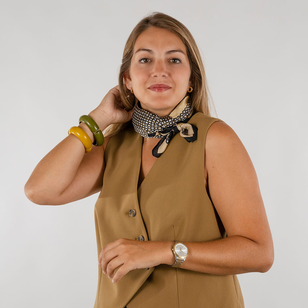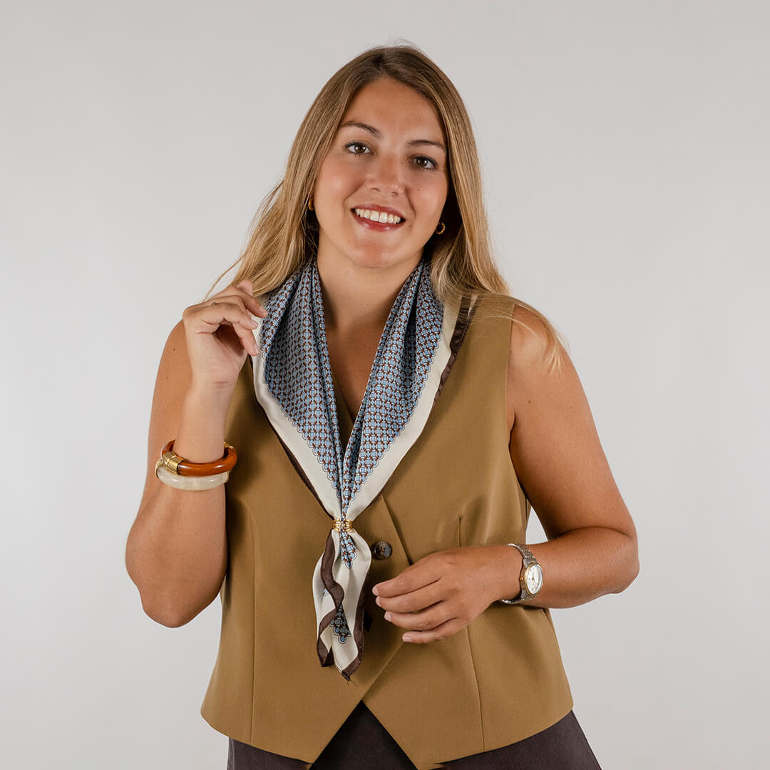 La magia del pañuelo de seda Francis está en su versatilidad. Un mismo accesorio te salva tanto un día de oficina con blazer como una cena improvisada con amigos. Además, su textura ligera lo convierte en la pieza ideal para entretiempo: abriga lo justo, sin perder frescura.