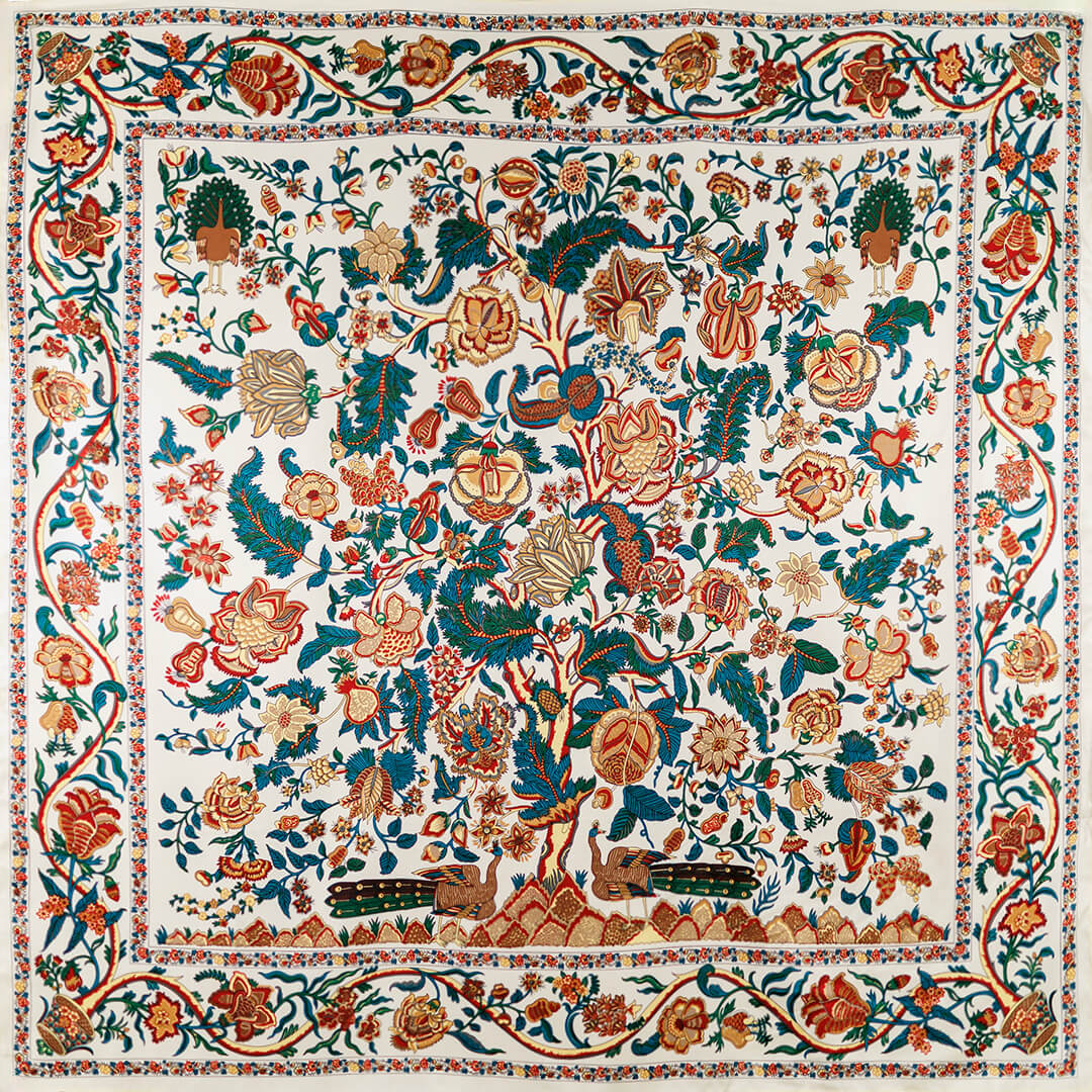 Pañuelo de seda Pavo Real de inspiración vintage con estampado floral y pavos reales. Colores versátiles que combinan con todo, elegante y atemporal.