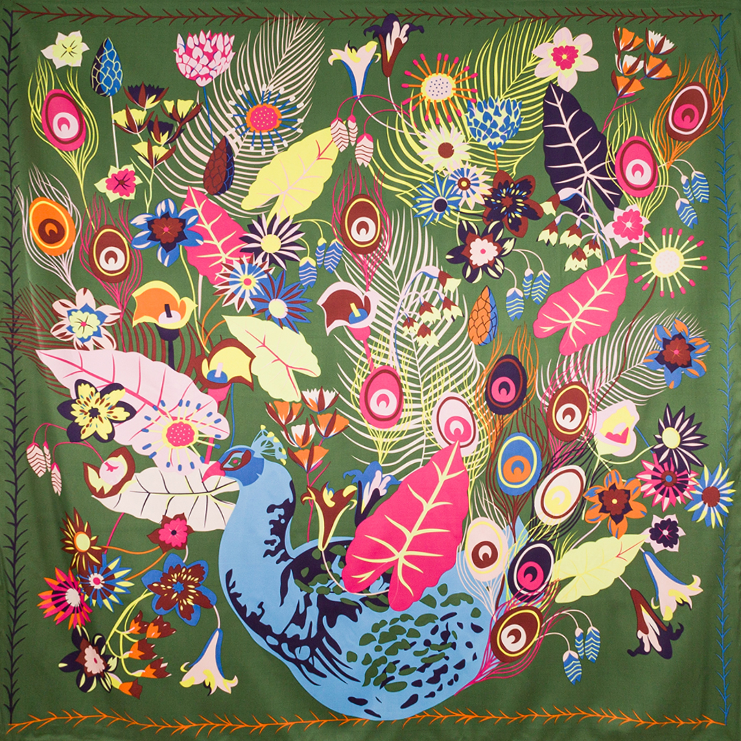 El Pañuelo Pavo Real con un estampado de pavo real y flores  en tonos azules, rosas y amarillo sobre fondo verde, este pañuelo es una verdadera joya para cualquier amante de la moda.