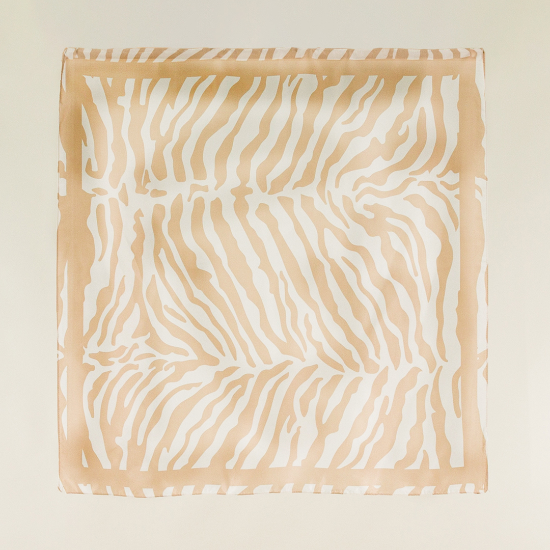 El Pañuelo Selva beige con un estampado de animal print en color beige fondo marfil, este pañuelo es una verdadera joya para cualquier amante de la moda.