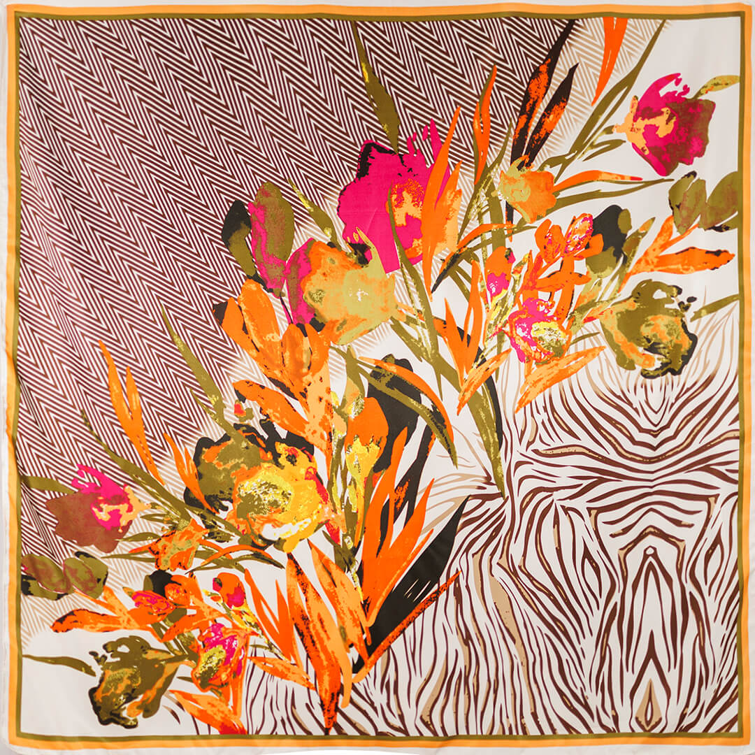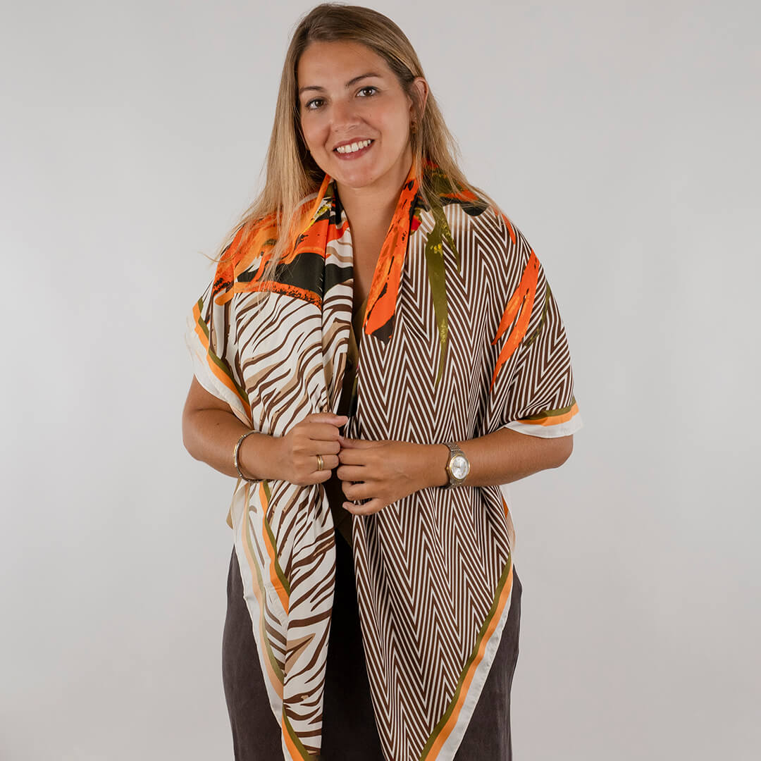 El Pañuelo Zigzag Naranja combina un print geométrico en zigzag marrón y blanco, que sirve de base sofisticada, con detalles en tonos naranjas y verdes que aportan frescura y vitalidad. Ese contraste lo hace súper versátil: puedes llevarlo con básicos en tonos neutros para que sea el protagonista, o mezclarlo con colores intensos si quieres un look más atrevido.