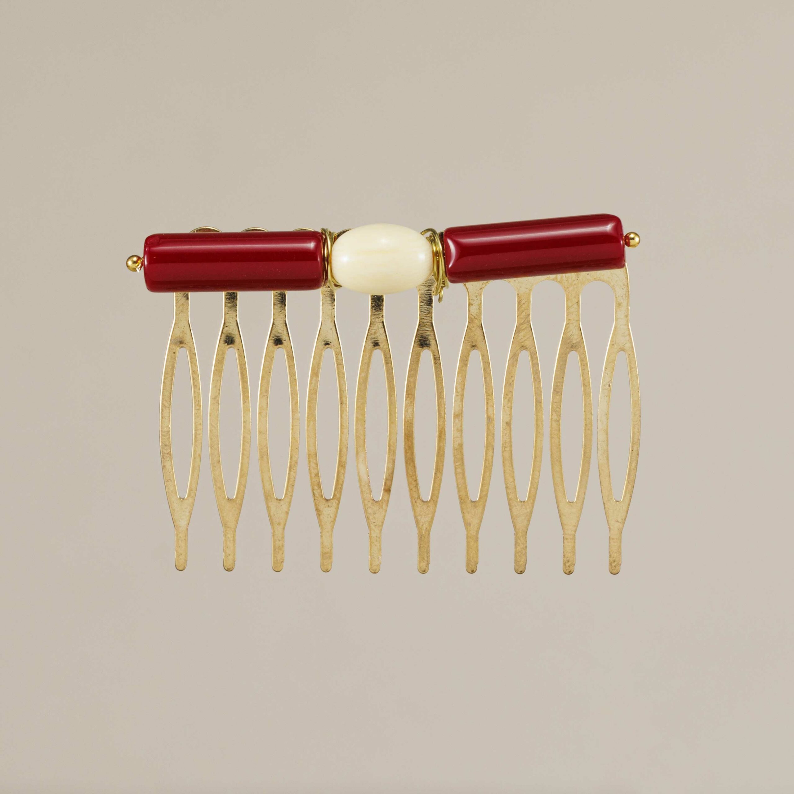 Peinecillo Dolores rojo oscuro de Darwin Collection, hecho a mano en Sevilla con metal dorado y piedras naturales. Ideal para completar tu look de flamenca con un toque original, cómodo y muy favorecedor. Combina a la perfección con recogidos y con el Pendiente Dolores a juego. ¡Un imprescindible para la feria o romerías!