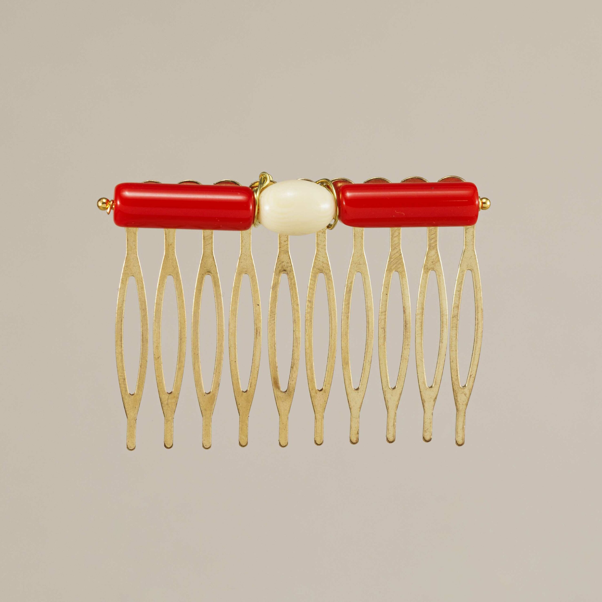Diseñado con mimo por nuestro equipo en Sevilla, el Peinecillo Dolores está montado en metal dorado, con dos piedras naturales alargadas en rojo  y una cuenta ovalada de hueso en el centro. Una joyita artesanal que no verás repetida en ningún otro sitio. ¡Y lo mejor! Es cómodo, ligero y fácil de colocar, así que podrás llevarlo durante horas sin que se te mueva ni te moleste.