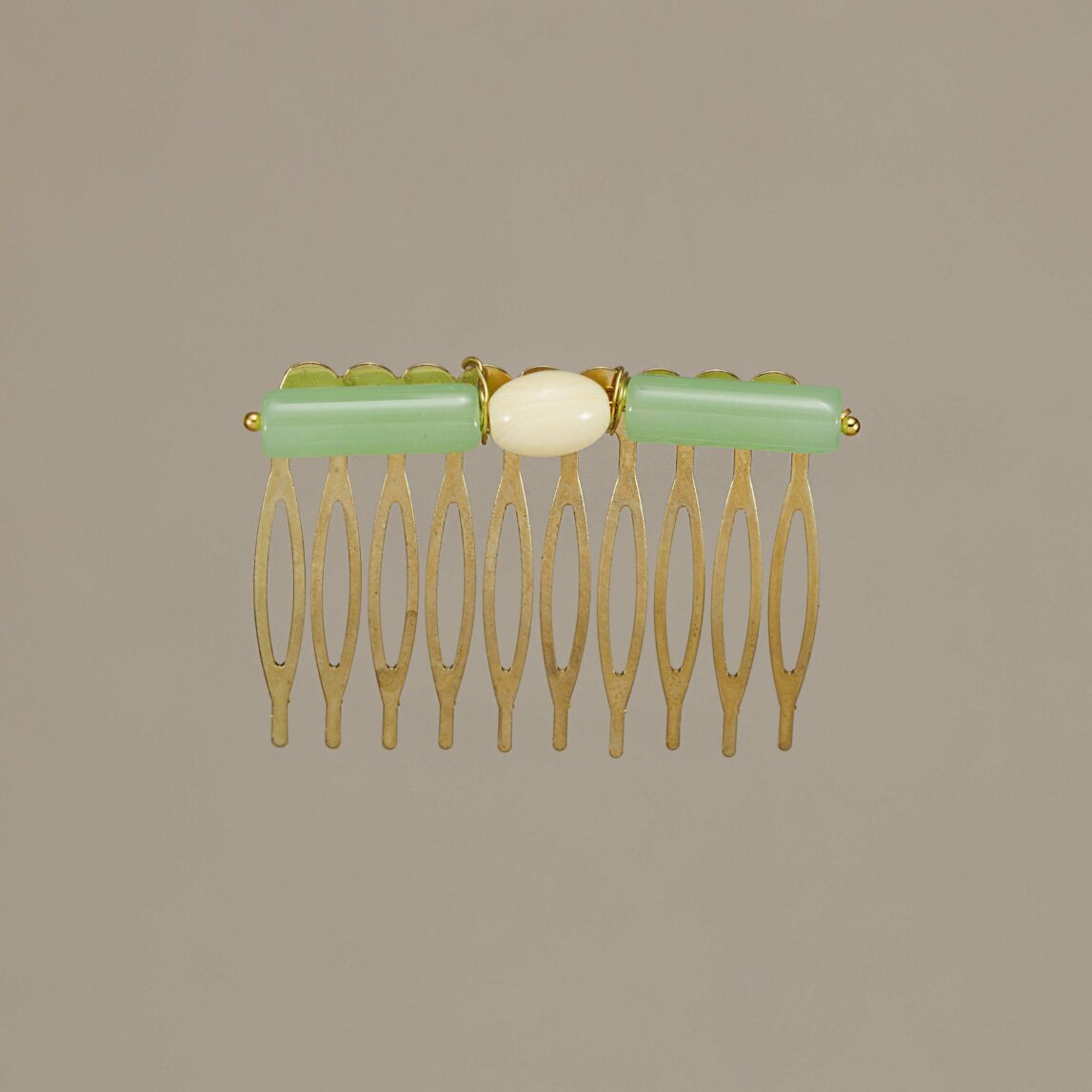 Diseñado con mimo por nuestro equipo en Sevilla, el Peinecillo Dolores está montado en metal dorado, con dos piedras naturales alargadas en verde y una cuenta ovalada de hueso en el centro. Una joyita artesanal que no verás repetida en ningún otro sitio. ¡Y lo mejor! Es cómodo, ligero y fácil de colocar, así que podrás llevarlo durante horas sin que se te mueva ni te moleste.