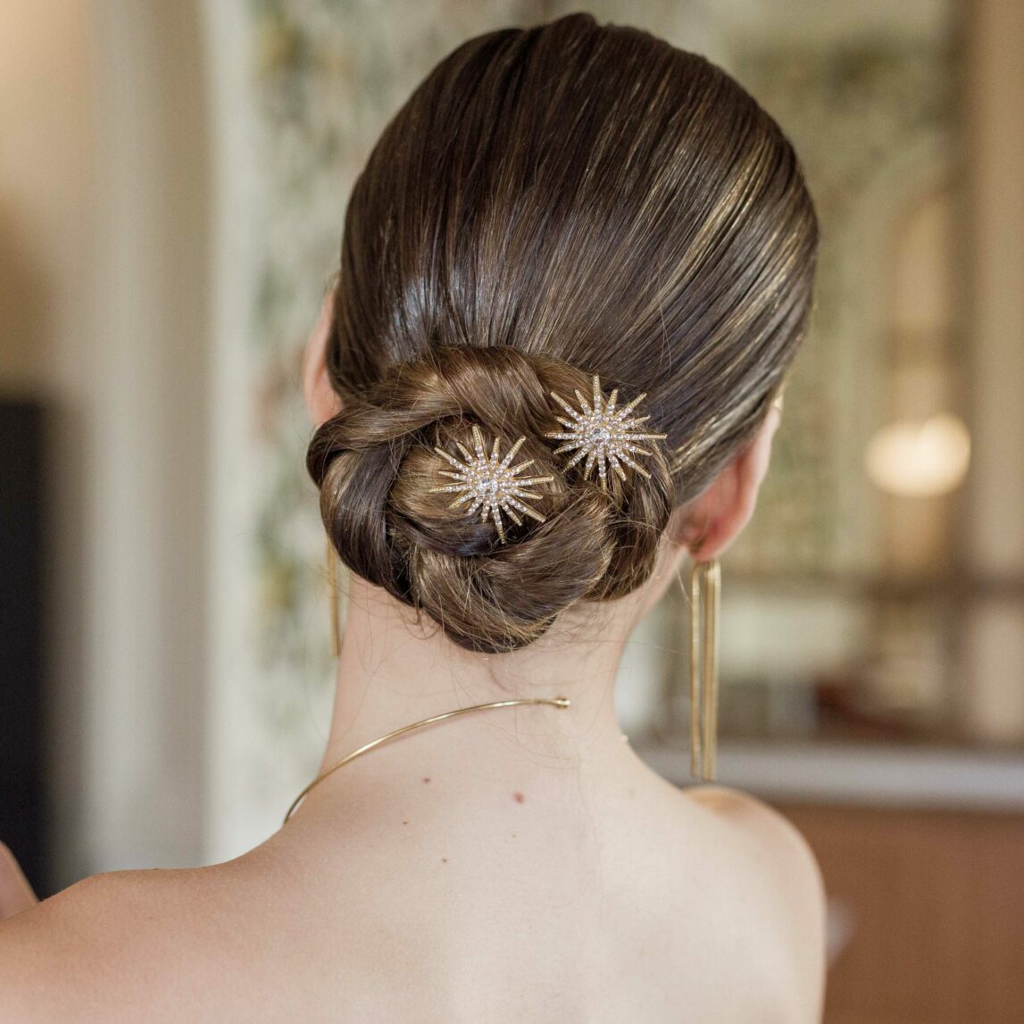 Además, puedes combinar el Peinecillo Horquilla Estrella Adara con nuestros Peinecillos Estrella plateados para crear un look aún más deslumbrante. Recomendamos colocar primero el peinecillo Estrella Adara, que es de mayor tamaño, y luego añadir los otros dos para un resultado impactante.