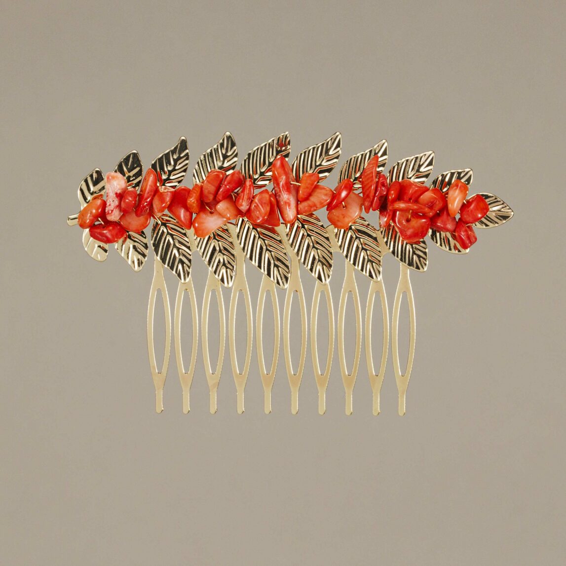 Aunque las tendencias en moda flamenca cambien cada año, los peinecillos en color oro siempre son un elemento fundamental en los complementos de feria. Este Peinecillo Laurel coral combina a la perfección elegancia y estilo.