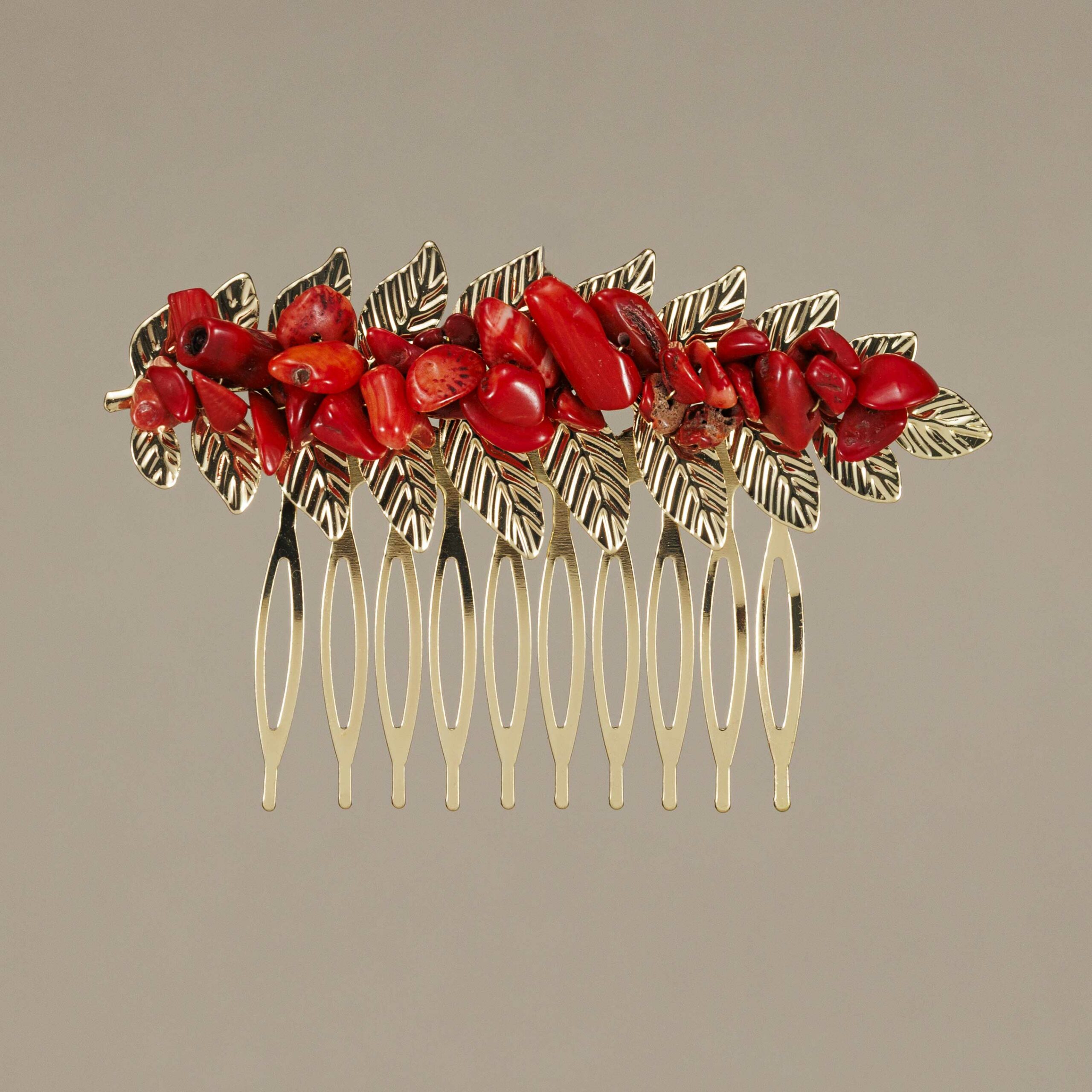 Aunque las tendencias en moda flamenca cambien cada año, los peinecillos en color oro siempre son un elemento fundamental en los complementos de feria. Este Peinecillo Laurel coral combina a la perfección elegancia y estilo.