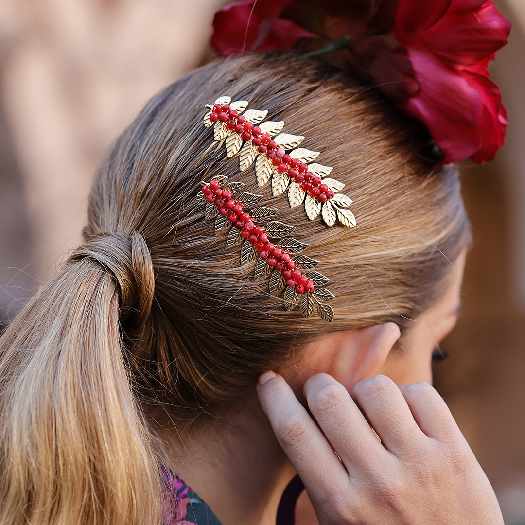 ¡Prepárate para brillar en la feria con nuestro nuevo Peinecillo Laurel coral rojo by Darwin Collection! Formando parte de la colección flamenca 2025, estos peinecillos son la apuesta fuerte para destacar en el real este año.