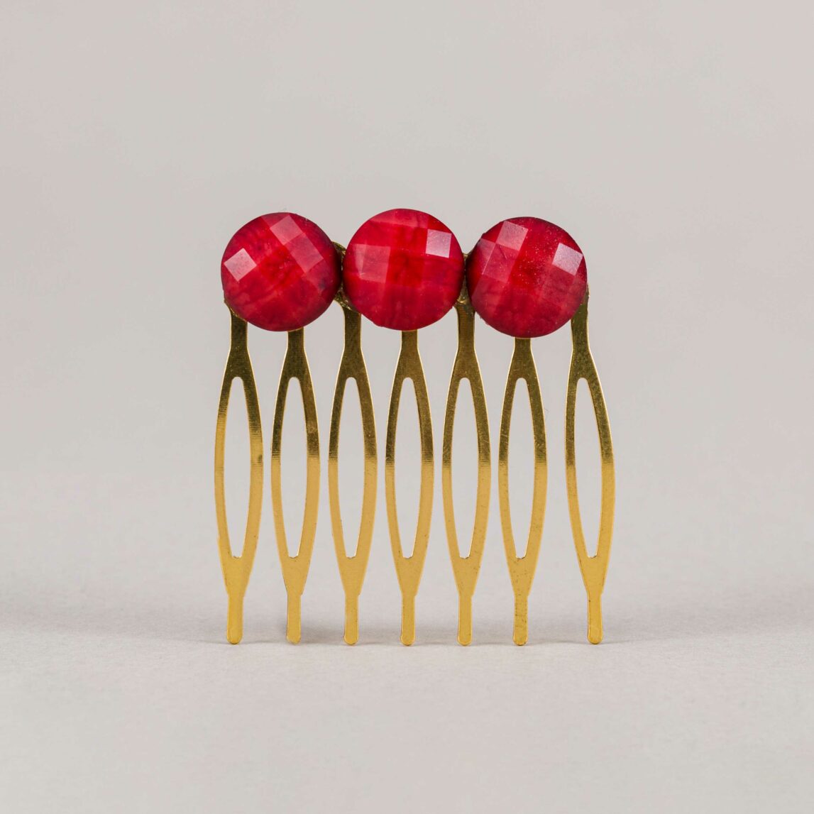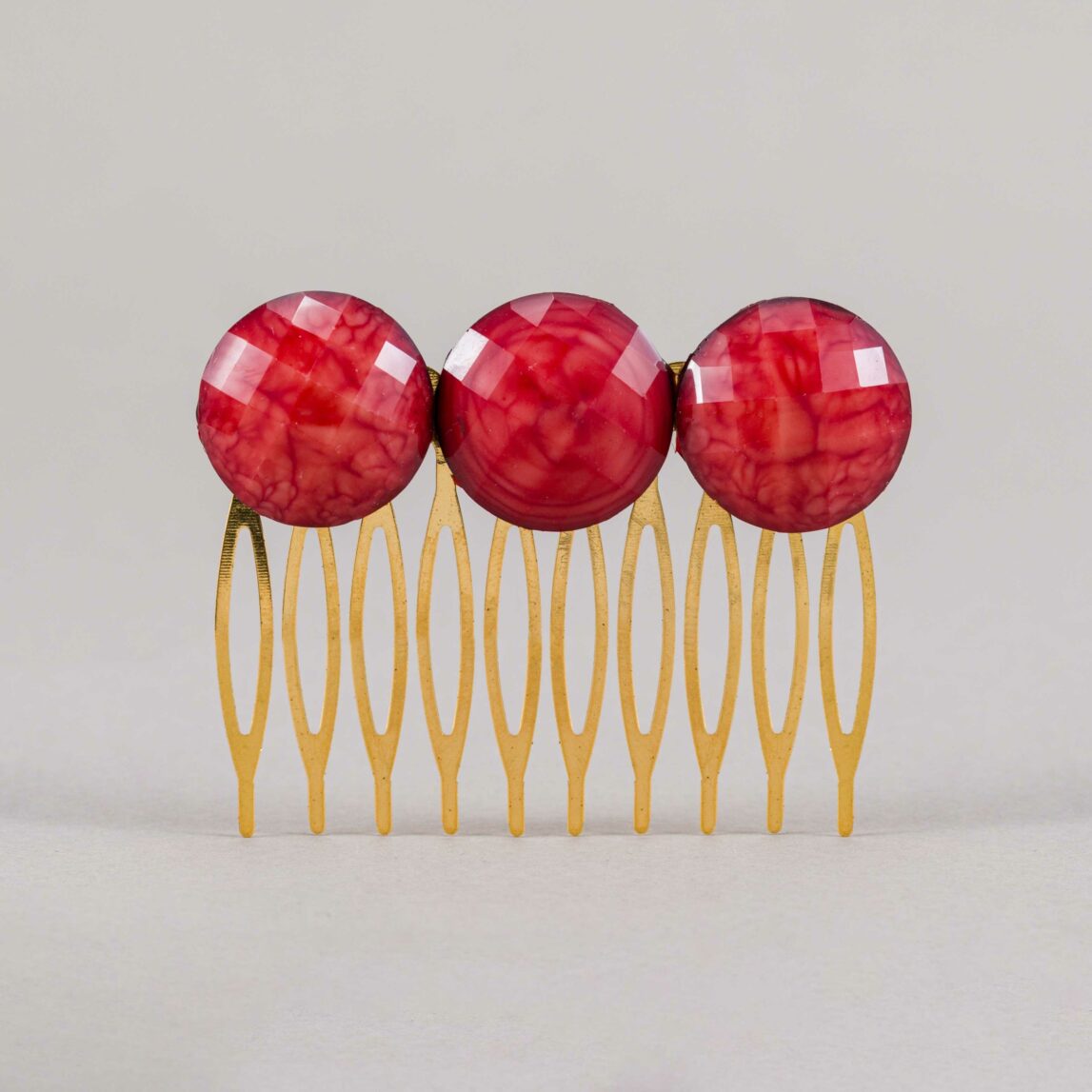 El Peinecillo Lucía Redondo es un accesorio de la Colección Flamenca 2025 de Darwin Collection, decorado con abalorios facetados en rojo sobre base dorada, ideal para dar brillo y personalidad a cualquier look de feria. Es cómodo, fácil de colocar y se mantiene firme incluso bailando. Combina perfectamente con moños, trenzas o coletas y puede acompañarse de pendientes, broches y mantoncillos a juego. Perfecto para ferias, romerías, bodas flamencas o cualquier evento especial.