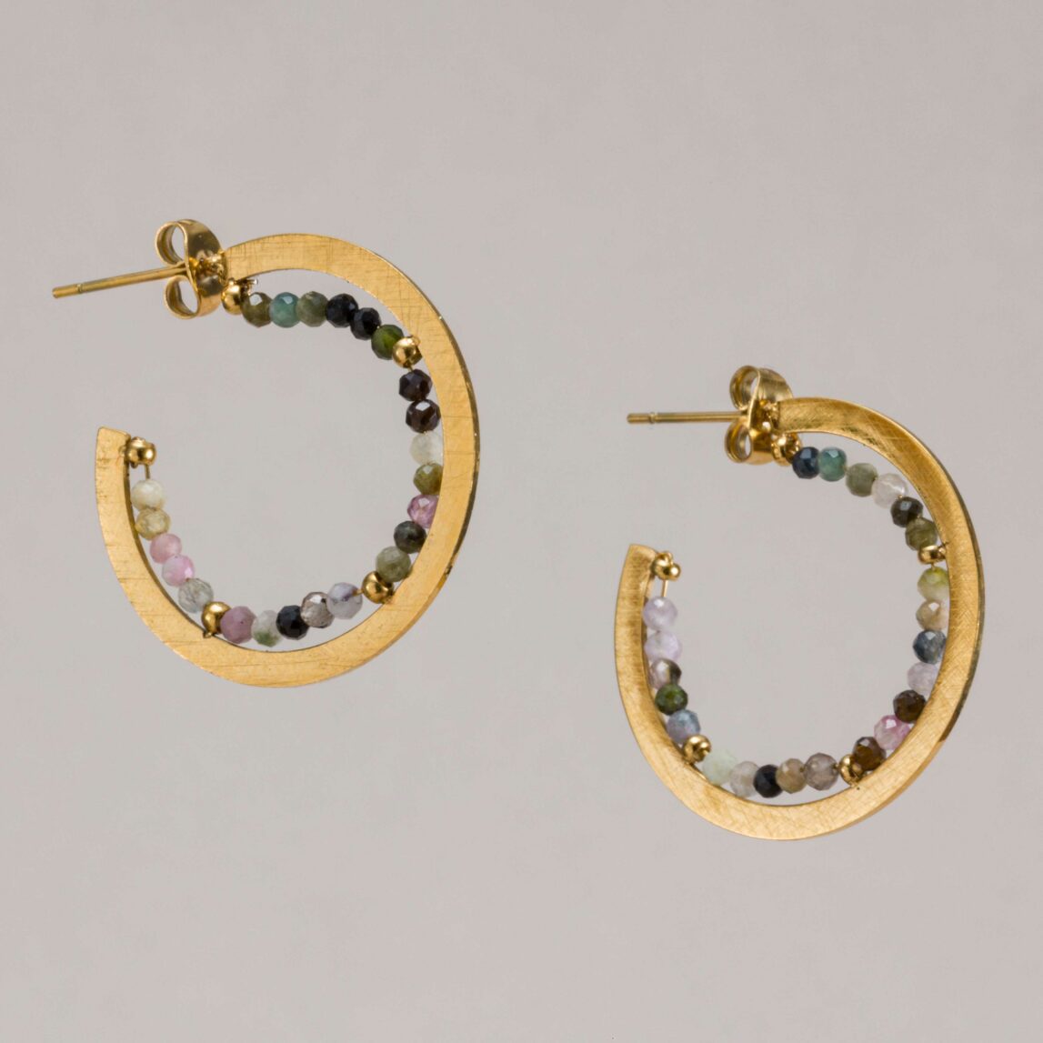 El cierre de mariposa garantiza una sujeción firme y cómoda, facilitando su uso prolongado sin molestias. Además, el diseño incluye un detalle único: todo el interior del aro está delicadamente perfilado con pequeñas piedras naturales de turmalina en tonos rosas y verdes, aportando un toque de color y distinción que realza cualquier outfit.