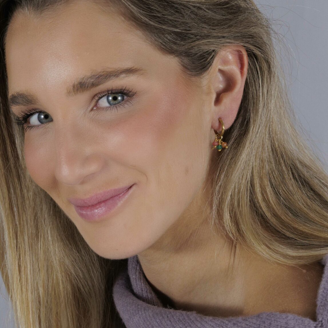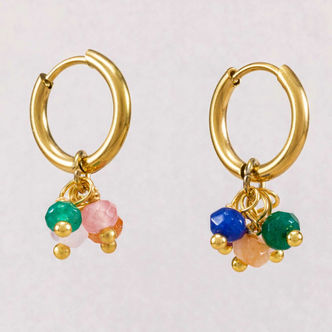 Los Pendientes Aro Maravillas  lleva varias piedras facetadas de colores que cuelgan como charm, llamando la atención sus colores tan vivos. Tiene un cierre de click y son de acero inoxidable. Se pueden mojar y son hipoalergénicos.