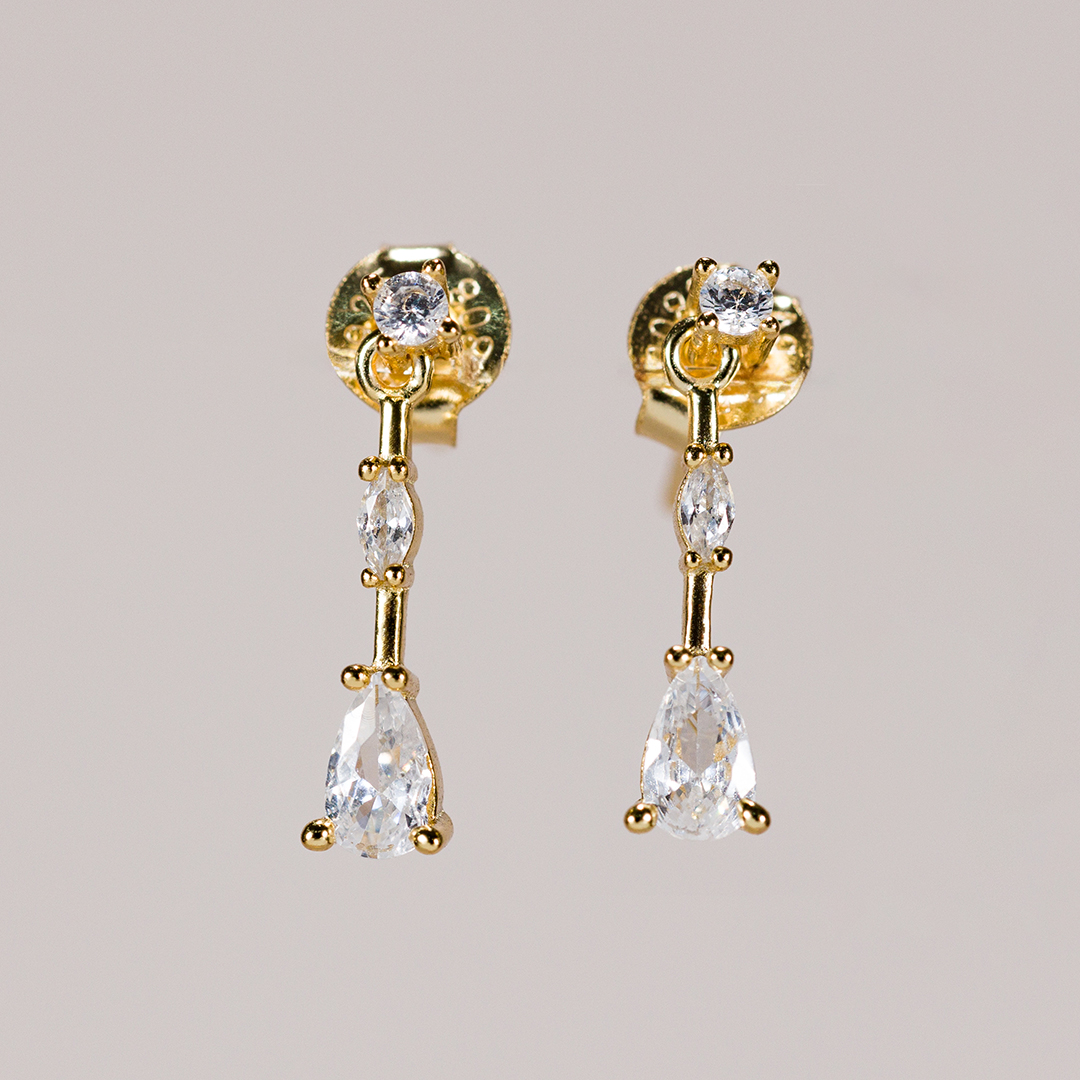 El diseño de los pendientes Celine es simplemente encantador. Comienza con una pequeña circonita redonda en la parte superior, de la que sale una barra adornada con otra circonita romboidal en el centro, y termina con una espectacular circonita en forma de lágrima, aportando movimiento y brillo a cada paso que des. Esta disposición de circonitas les da un aire sofisticado y moderno, haciéndolos perfectos para una novia o cualquier invitada que quiera destacar.