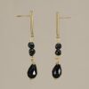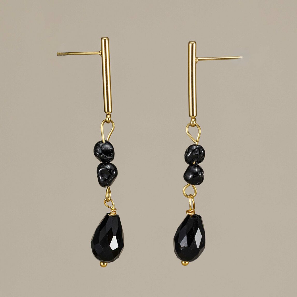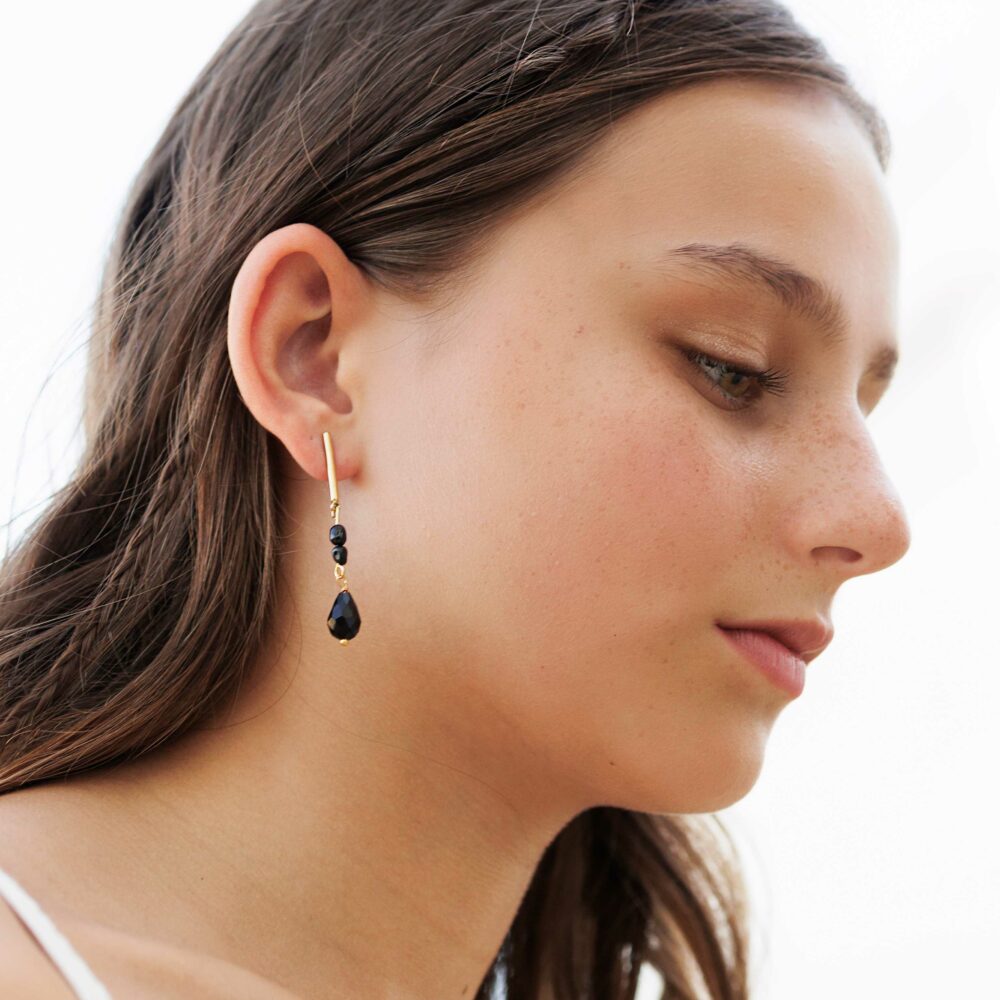 Están montados con una barra dorada finita pegada al lóbulo, y de ahí cuelgan dos piedritas negras de ónix con formas irregulares que rematan en una lágrima facetada también en negro. Un diseño sencillo pero con rollo, que estiliza y aporta luz, sobre todo si vas con el pelo recogido.