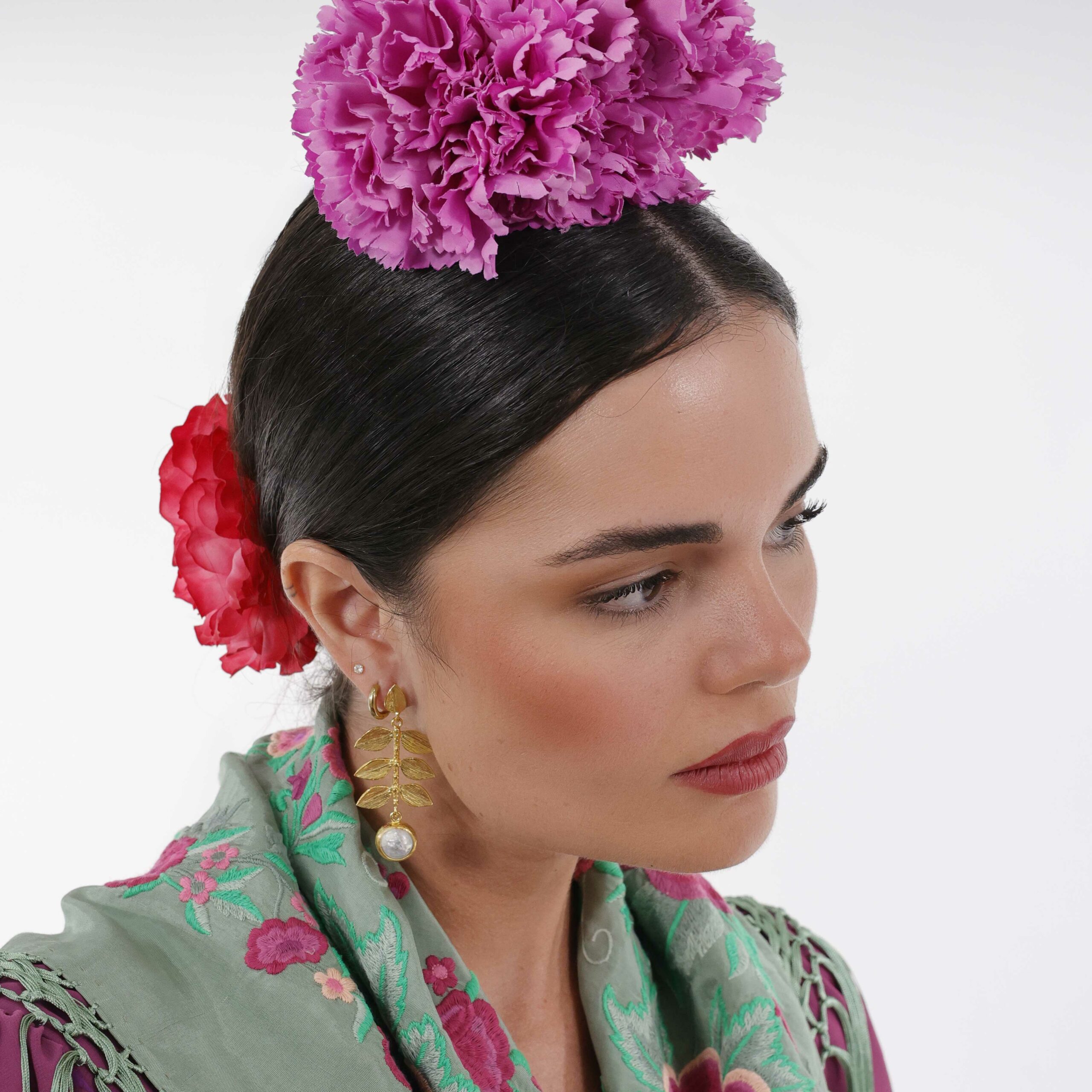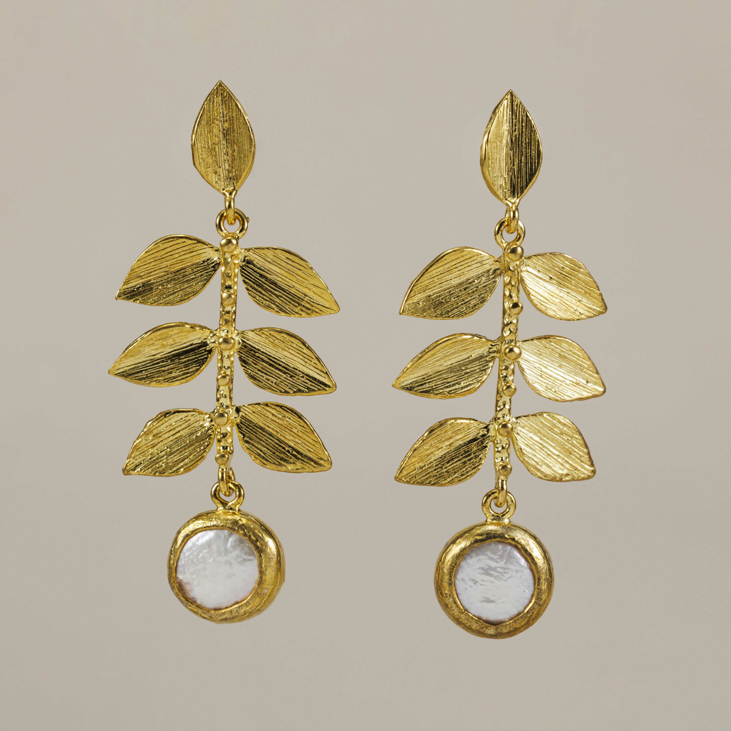 La parte superior del pendiente lleva una hoja dorada de la que cuelga una barra con tres hojas a cada lado, rematada con una perla de río engarzada a modo chatón o bisel en el mismo color dorado.