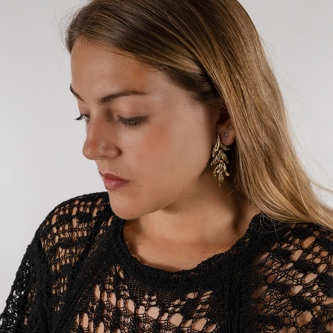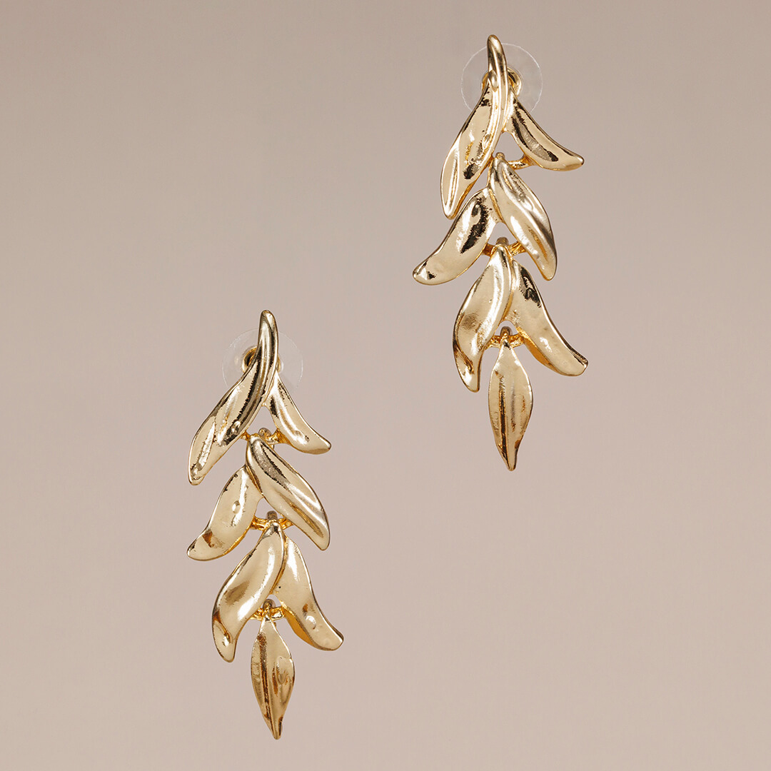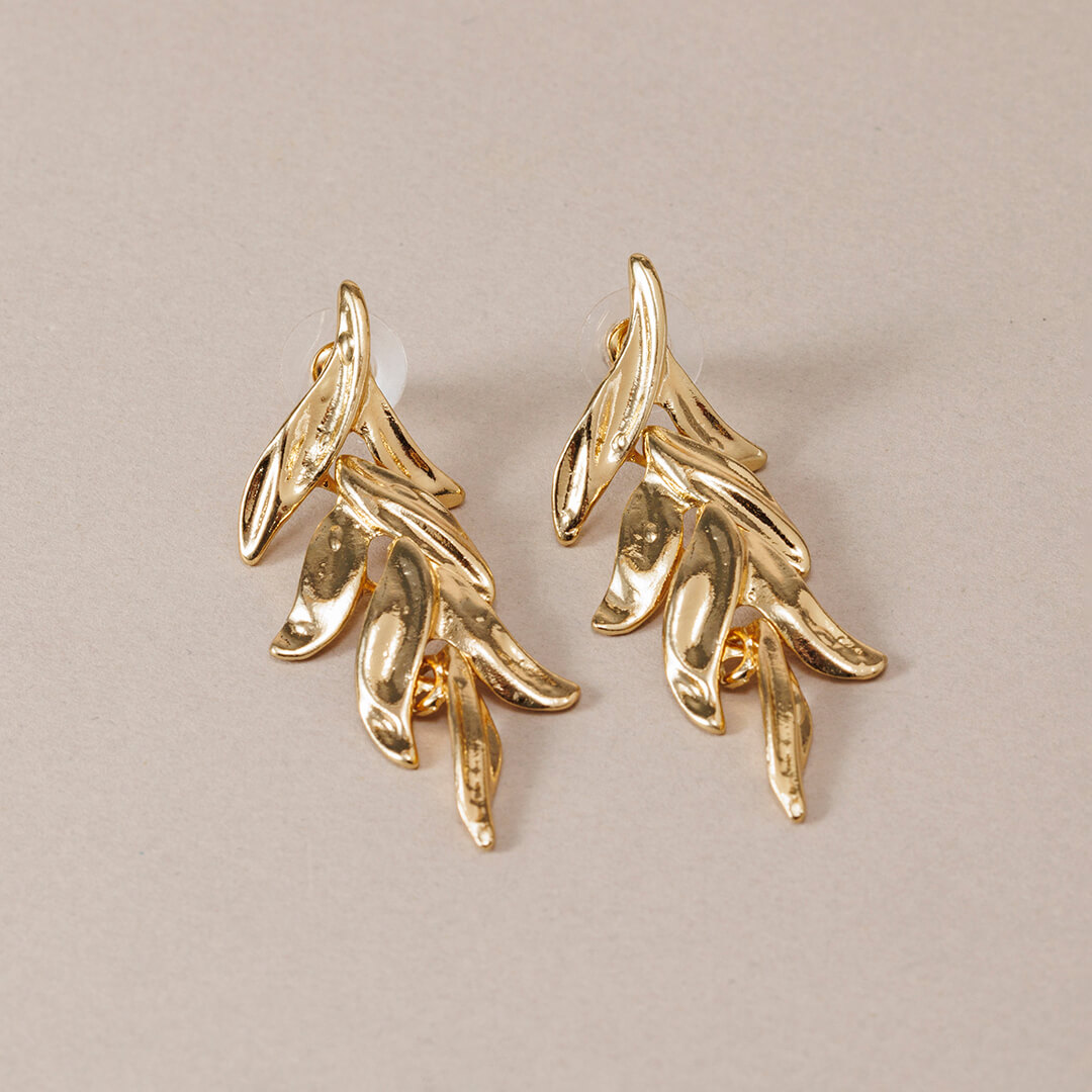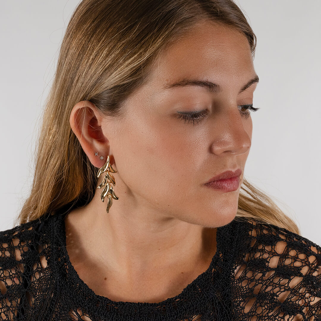 Pendientes largos de metal dorado con diseño de hojas de olivo. Ligeros, cómodos y versátiles, perfectos para el día a día o un look de invitada.