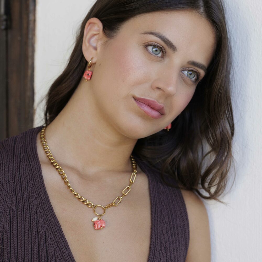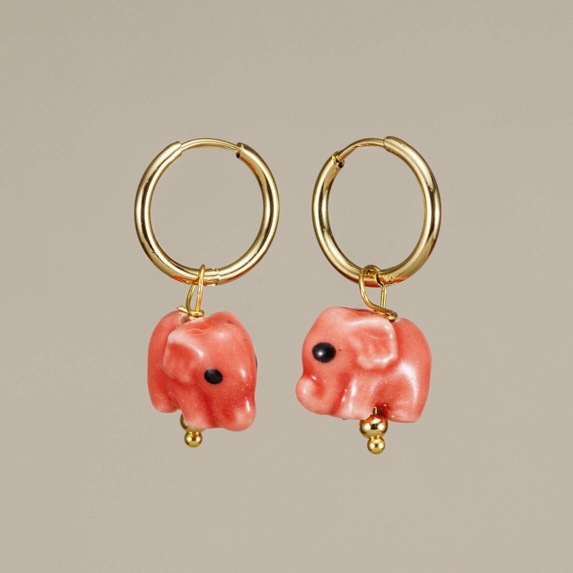 La verdadera joya de estos pendientes es el delicado elefante de cerámica esmaltada que cuelga elegantemente debajo del cierre. Este pequeño elefante, símbolo universal de sabiduría, fuerza y buena suerte, está hecho a mano con un acabado esmaltado brillante que aporta un toque artesanal y sofisticado a tu look diario o a esa ocasión especial.