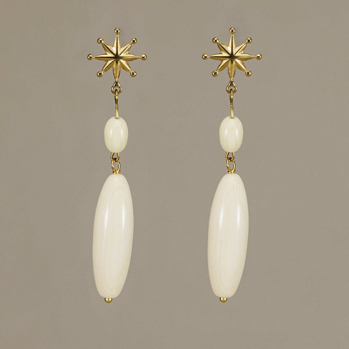 Elaborados con materiales ligeros y acabados de alta calidad, los pendientes Luisa destacan por su estructura vertical con formas ovaladas en tono marfil, suspendidas de una delicada estrella dorada. Este contraste crea un efecto elegante y sofisticado que ilumina el rostro y aporta un aire distinguido. Con un largo de 6 centímetros, estos pendientes estilizan sin recargar, siendo perfectos para lucir cómodamente durante horas.